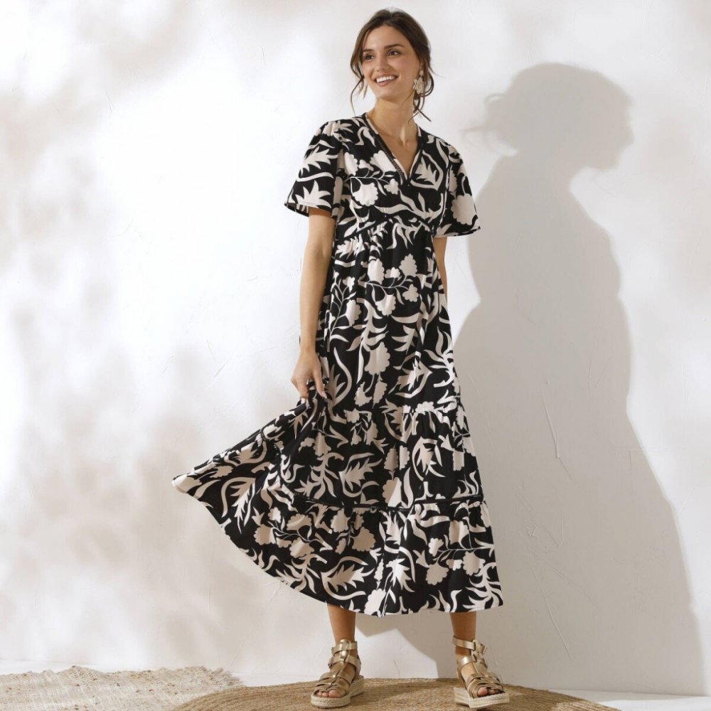 Vykročte do nového dne v dlouhých šatech s potiskem a háčkovanými detaily! Rozšířený střih lichotí postavě. Háčkovaná vsadka ve výstřihu do V. Vpředu v pase háčkování, vzadu pružné. V ramenou nařasení. Motýlí rukávy. Širší střih se 2 volány, z toho 1 s háčkovaným zakončením. Rovný spodní lem. Lze prát v pračce.