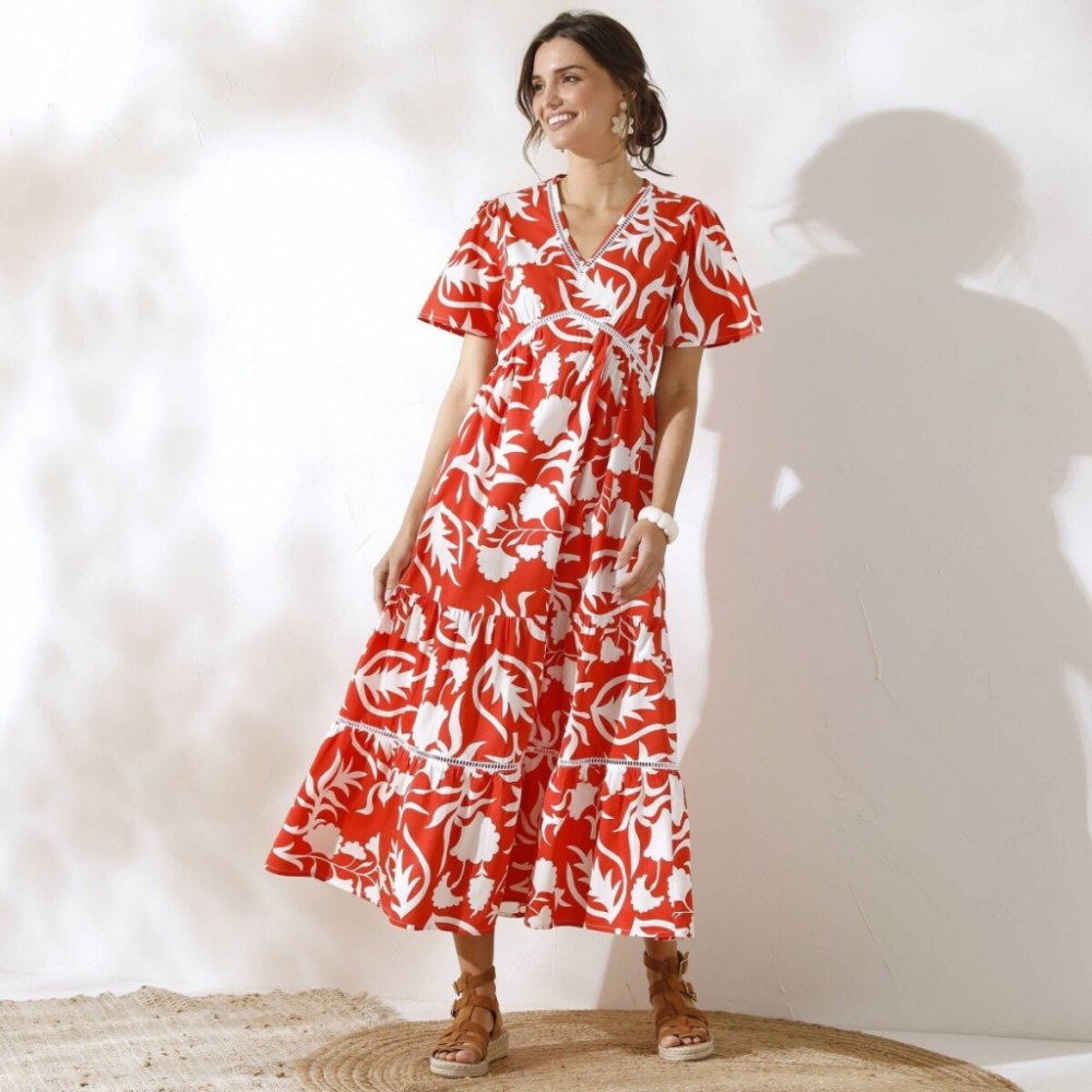 Vykročte do nového dne v dlouhých šatech s potiskem a háčkovanými detaily! Rozšířený střih lichotí postavě. Háčkovaná vsadka ve výstřihu do V. Vpředu v pase háčkování, vzadu pružné. V ramenou nařasení. Motýlí rukávy. Širší střih se 2 volány, z toho 1 s háčkovaným zakončením. Rovný spodní lem. Lze prát v pračce.