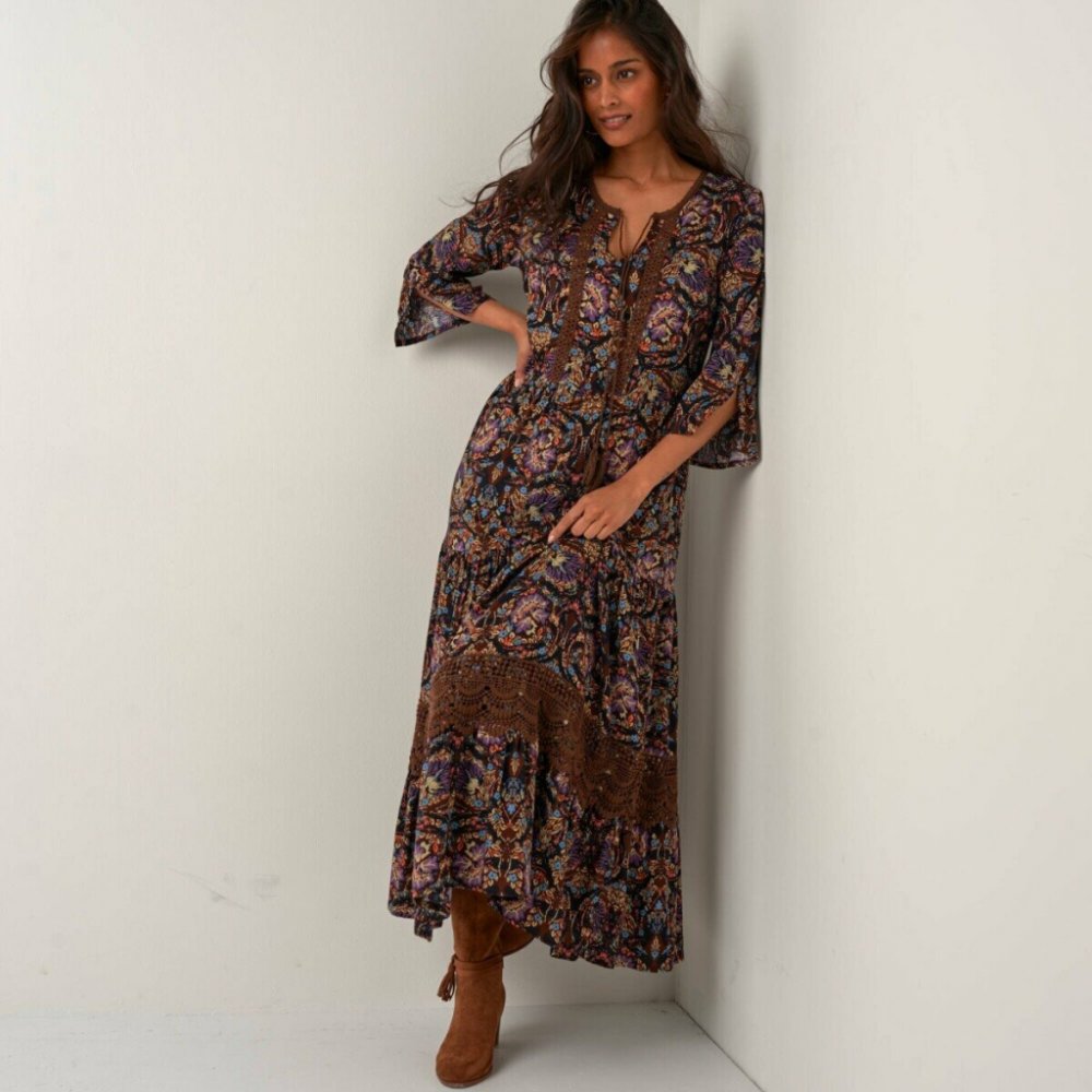Dlouhé šaty s potiskem Vám dodají rafinovaně ženský vzhled. Kulatý výstřih s průstřihem, ažurovou lemovkou a šňůrkou na zavázání se střapci. 3/4 rozšířené rukávy zakončené rozparkem. Nařasený pas. Pod přestřižením v pase 3 volány, z toho 1 z macramé. Lze prát v pračce.