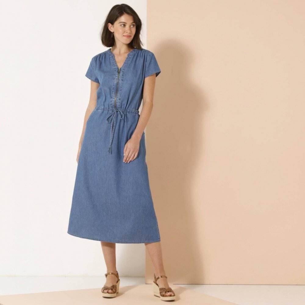 Toužíte po elegantních šatech, které se hodí pro různé příležitosti? Pak zvolte džínové dlouhé šaty se zipem ve výstřihu. Z lehkého denimu. Délka do půli lýtek. Kulatý výstřih s průstřihem a zipem až do pasu. Krátké rukávy. V pase přestřižení a tunýlkem protažená šňůrka. 2 kapsy vpředu. Mírně rozšířený dolní lem. Vzdušná tkanina, dokonale padnoucí. Standard 100 podle Oeko-Tex (CQ 1216 / 3 IFTH). Tato známka označuje textilní výrobky, které byly podrobeny laboratorním testům na široké spektrum škodlivých látek a výrobek je bezpečný nad rámec platných norem. Lze prát v pračce.