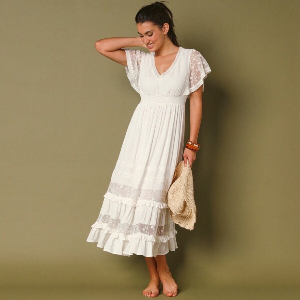 Okouzlující šaty inspirované svatebním stylem Vám přinášíme v letní verzi. Výstřih do "V" s macramé pruhem. Široký volán z vyšívaného tylu s macramé tvořící volánové rukávy. Žabičkovaný pas. Macramé našitý prýmek, pruhy z vyšívaného tylu a nařasené volánky na sukni. Rozšířený spodní díl. Podšívka trupu a sukně až k druhému tylovému pruhu. Lze prát v pračce.