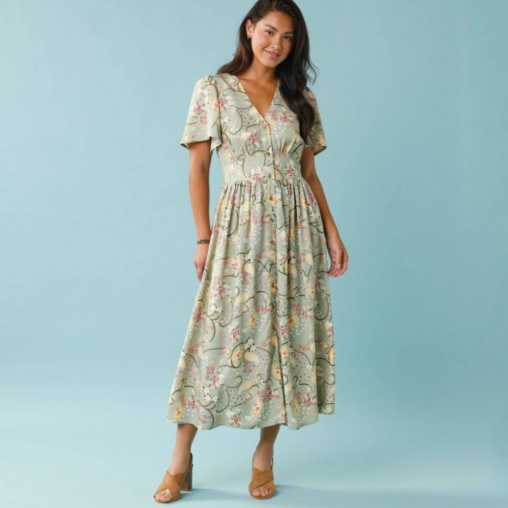 Vzdušné, s knoflíčkovým zapínáním a potiskem jarního vzoru, dlouhé šaty jsou proporčně navržené pro malou výšku postavy. Výstřih do V. Krátké motýlí rukávy. V ramenou nařasení. Vpředu a vzadu v pase široký vsazený pruh s nařasením. Rozšířený spodní lem. Tento produkt byl vyroben z viskózy Lenzing™ EcoVero™. Ekologická viskóza je materiál vyrobený z buničiny z udržitelně obhospodařovaných lesů. Výr...