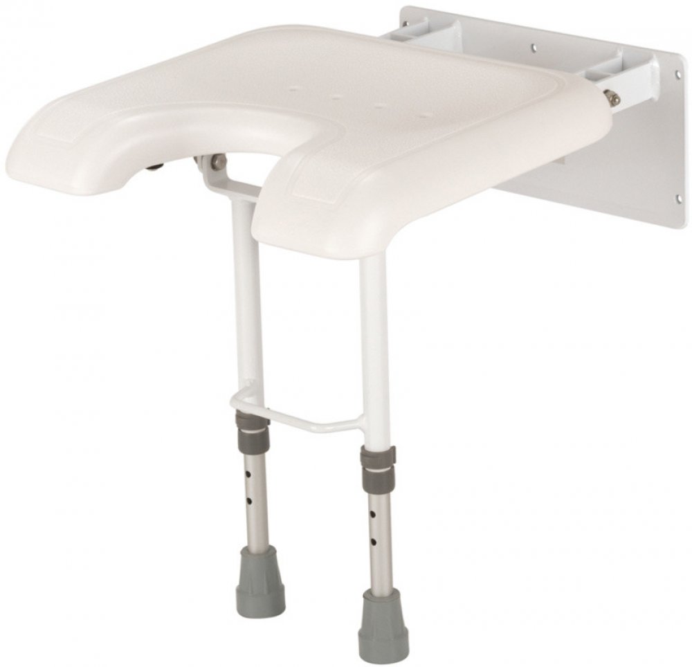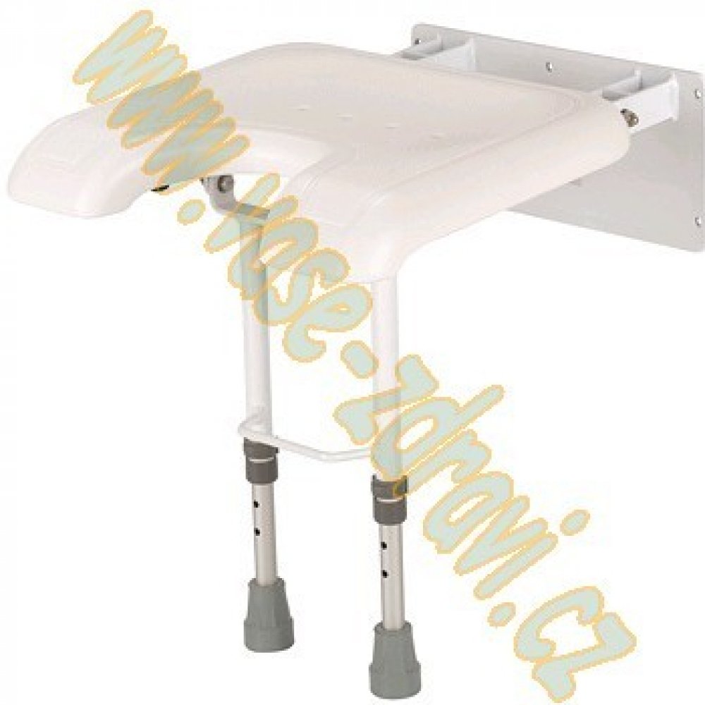 Sklopná sedačka do sprchy 4279 D s duralovým rámem, pojistkou sklápění, podpůrnými nohami a nastavitelnou výškou. Plastové sedátko s výřezem pro intimní hygienu.