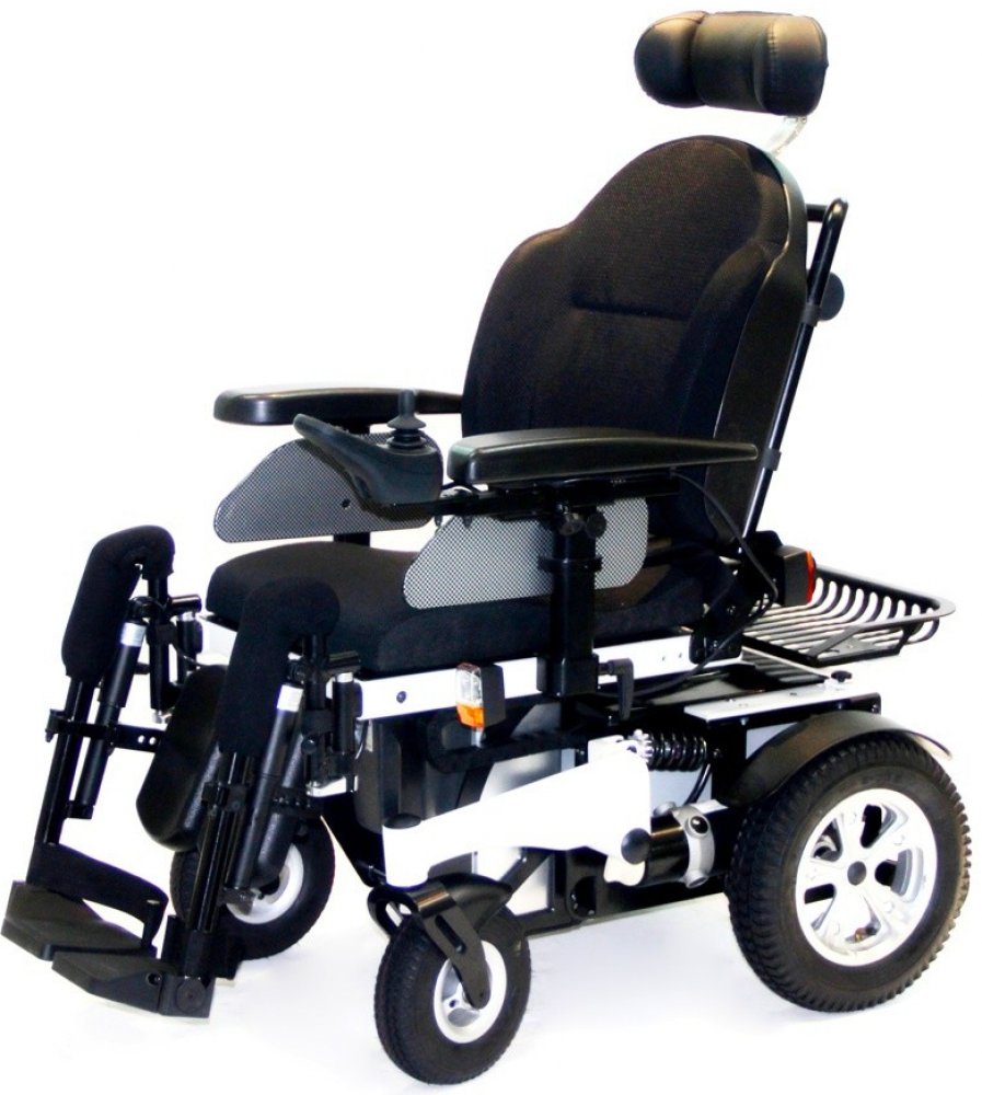 polstrovaná anatomická sedačka a opěrka zad elektricky nastavitelná výška sedu 55-85 cm elektricky nastavitelný úhel sedu a opěrky zad elektricky nastavitelný úhel podnožek nastavitelná polstrovaná opěrka hlavy odnímatelné a odklopné podnožky výškově nastavitelné stupačky odnímatelné šířkově nastavitelné postranice nastavitelná výška područek odpružení předních i zadních plných kol stabilizační kolečka proti převrácení bezpečnostní dvoubodový popruh odklopný ovládací joystick (pravá/levá) přední i zadní osvětlení