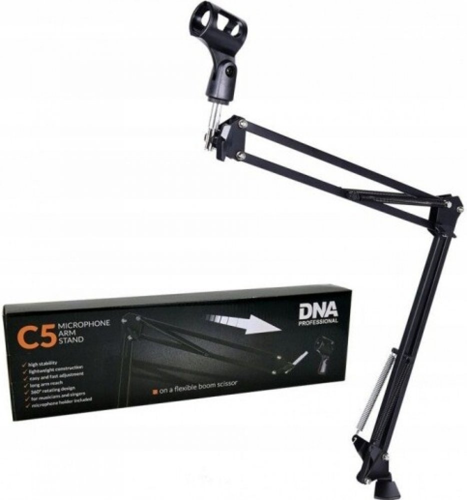 DNA C5 je plně profesionální, lomený mikrofonní stojan připevněný k desce stolu nebo stolu, spolu s držákem na ruční mikrofon. Ideálně se hodí do domácího i profesionálního nahrávacího studia. Výložníkové rameno se skládá ze dvou sekcí a má široký rozsah nastavení. Standardní rozpěrný mikrofonní držák se hodí pro téměř všechny typy dynamických vokálních mikrofonů. Díky tomu máme jistotu, že je náš mikrofon dobře upevněn. Technické specifikace: Typ: stolní mikrofonní stojan, lomený Barva: černá Délka ramen: 2 x 33 cm Max. Výložník: 80 cm Max. nosnost: 1,4 kg Hmotnost: 0,5 kg Součástí balení: držák na mikrofon
