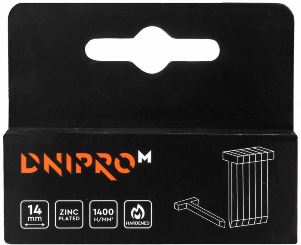 Sešívací hřebíky Dnipro-M, 14 mm, se používají pro montážní práce, renovace, stavebnictví a čalounění. Hřebíky o výšce 14 mm, šířce 2 mm, tloušťce 1,25 mm, balení 1000 ks.