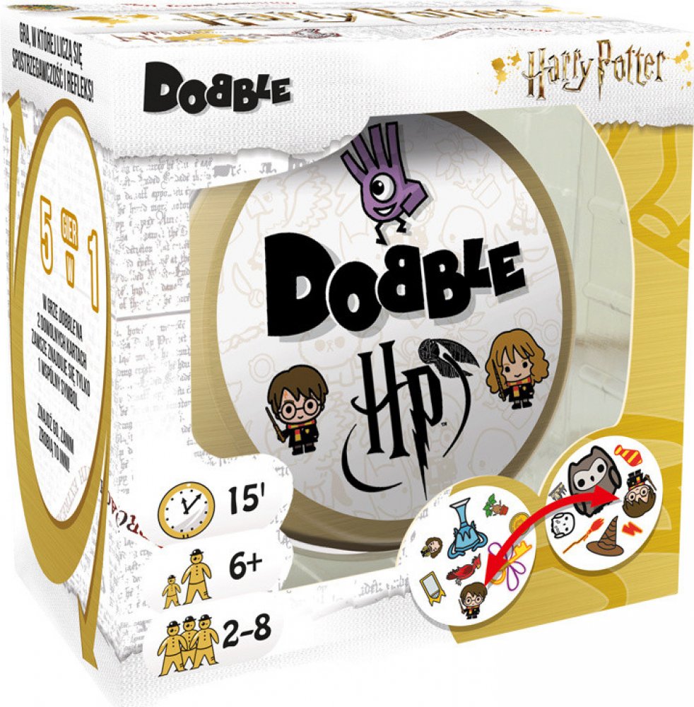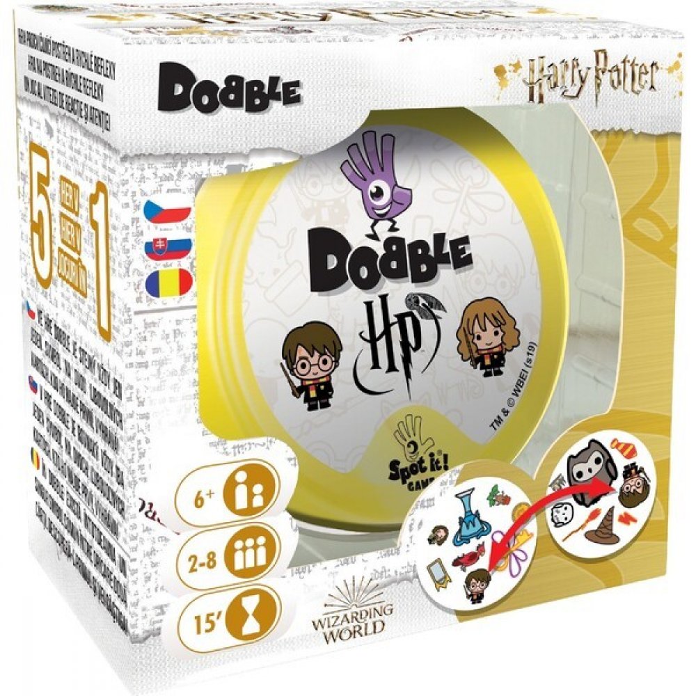 Hra kombinuje kultovní kouzelnický svět, vytvořený spisovatelkou J.K. Rowlingovou, s jednou z nejpopulárnějších rodinných her. Hráči se pokoušejí najít jeden společný symbol mezi dvěma kartami v hravé bitvě rychlosti a postřehu, jež obsahuje stylizované snímky Harryho Pottera, Hermiony Grangerové a Rona Weasleyho, kouzelnických hůlek, různých tvorů a bytostí, symbolů Bradavic a mnohé další. Rychlost, postřeh, reflexy! Dobble, to je 57 různých symbolů, 55 karet, 8 symbolů na kartě a každé dvě karty spolu mají společný pouze jeden! Hra nabízí zcela unikátní zábavu. Hráči zde hledají dva stejné symboly na kartách při různých verzích hry (v pravidlech je popsáno celkem 5 her). Super jsou kulaté karty i jednoduchá pravidla vysvětlená doslova za pár sekund. Cílová skupina jsou děti i dospělí - všichni, kdo se chtějí pořádně bavit a nemají čas pročítat dlouhá pravidla. Plechová krabička zaručuje bezpečí karet a jednoduše umožňuje mít hru vždy u sebe. Vyzkoušejte i Vy postřehový fenomén Dobble a jistě budete překvapeni, jak i tak jednoduchá hra může být zábavná!