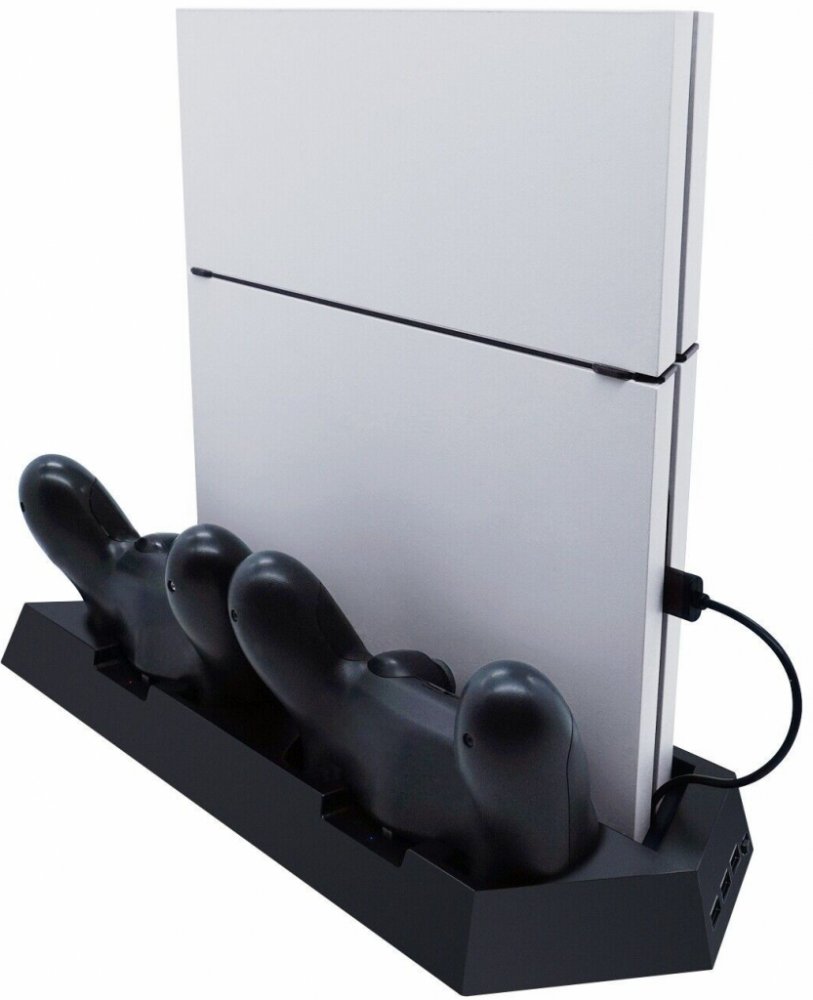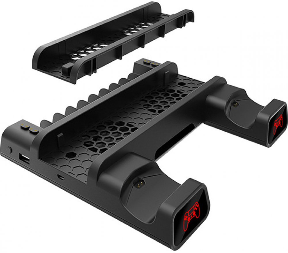 Multifunkční stanice od značky DOBE - umožňuje dobíjet až dva PlayStation 4 ovladače a chladit konzole PlayStation 4/Slim/Pro, LED indikátor stavu nabití baterie ovladačů, pořadač na 10 her, vyrobeno z kvalitních ABS plastů, včetně přepěťové ochrany. Konzole, ovladače ani hry nejsou součástí balení.