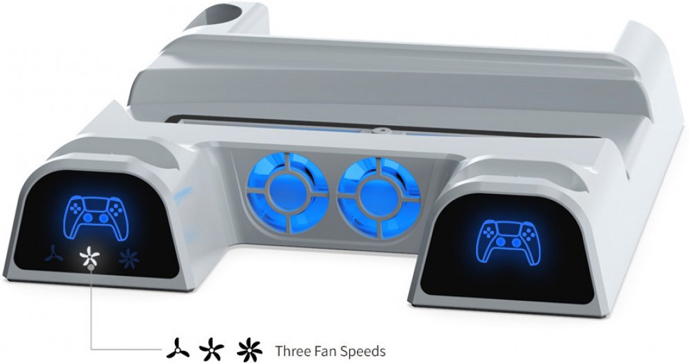 Multifunkční stanice od značky DOBE - umožňuje dobíjet až dva PlayStation 5 ovladače a chladit konzoli PlayStation 5, LED indikátor stavu nabití baterie ovladačů, 3 volitelné rychlosti chladičů, pořadač na 11 her, slot na dálkový ovladač, vyrobeno z kvalitních ABS plastů, včetně přepěťové ochrany.