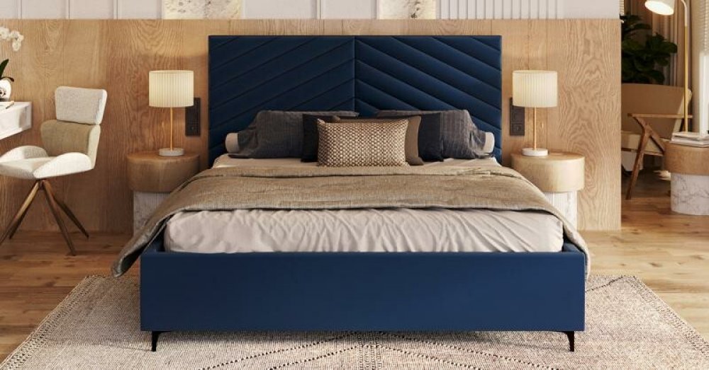 Luxusní čalouněná postel s dekorativním širokým čelem.