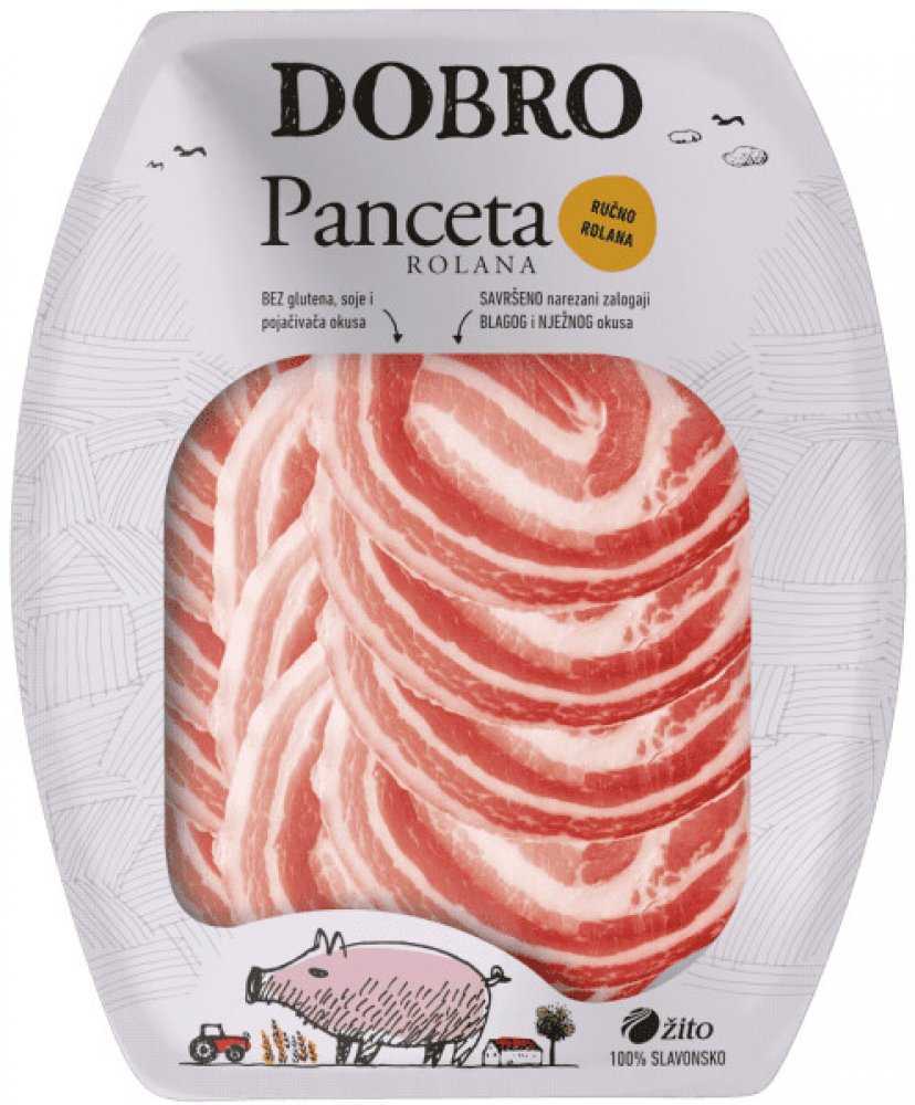 Dobro Pancetta rolovaná krájená 90 g– tato pancetta vzniká z pečlivě vybraného vepřového boku, který je ručně rolován, jemně solen, okořeněn a nechán dozrát do dokonalé chuti. Výsledkem je harmonická kombinace slanosti, jemného koření a příjemné textury, která se rozplývá na jazyku. Balení 90 g je ideální pro studené i teplé pokrmy– antipasti, saláty, těstoviny nebo pizzu.