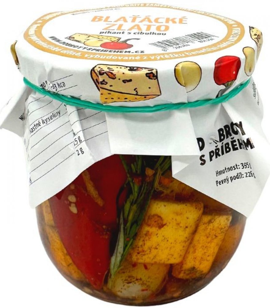 Složení: Sýr zrající Bláťácké zlato 41% (MLÉKO, jedlá sůl, MLÉKAŘSKÉ KULTURY, rostlinná barva), řepkový olej, cibulky sterilované 9% (cib...