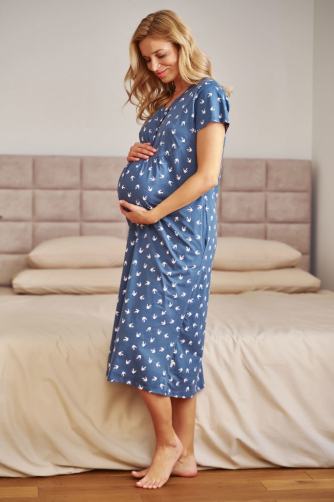 Tmavě modrá kojicí a těhotenská noční košilka je vyráběna v plus size velikostech (2XL a 3XL) a v midi délce, což ocení zvláště ženy, které preferují při spaní zakrytí nohou. Díky řasení pod prsy se košile perfektně přizpůsobí rostoucímu bříšku, a stejně tak dobře vám poslouží i po porodu, kdy vaše poporodní bříško hezky schová.