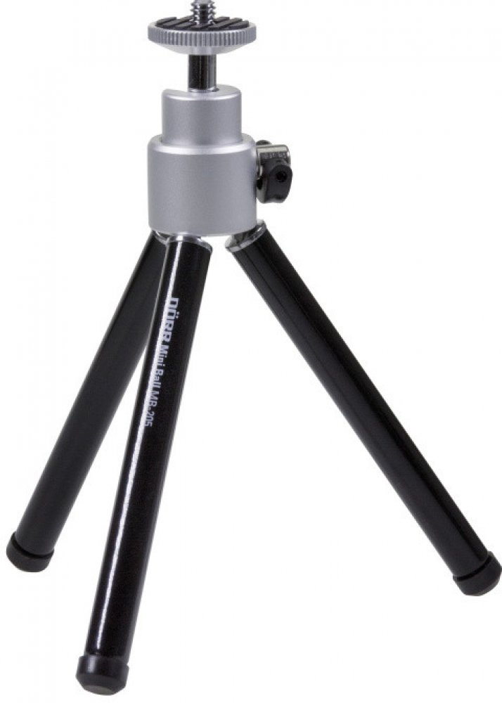 Kompaktní hliníkový stativ s klasickým 1/4" závitem umožňuje nastavení výšky v rozmezí od 15 do 20,5 centimetrů. Je vybaven gumovými hroty pro lepší stabilitu a kulovou hlavou.