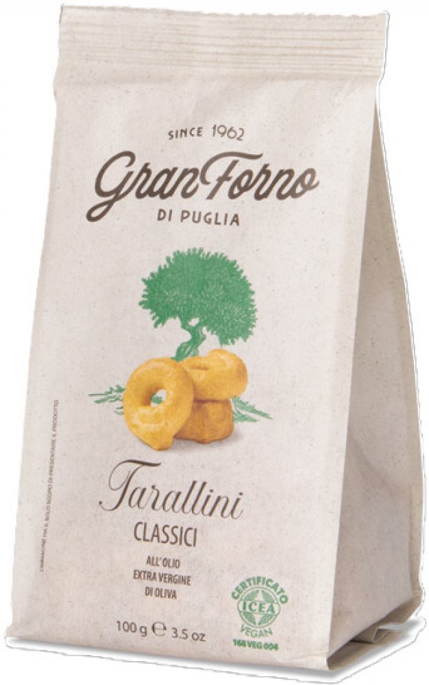 Tarallini Classici slané křupavé kroužky s extra panenským olivovým olejem GRAN FORNO 100g Tarallini Classici jsou malé křupavé slané kroužky. Typická italská specialista regionu Puglia/Apúlie vyrobená z pšeničné mouky, extra panenského olivového oleje a bílého vína. Lahodný snack k vínu či pivu. V Itálii se konzumují během aperitivo, což je odpolední pauza spojená s drinkem a něčím malým na zub n...
