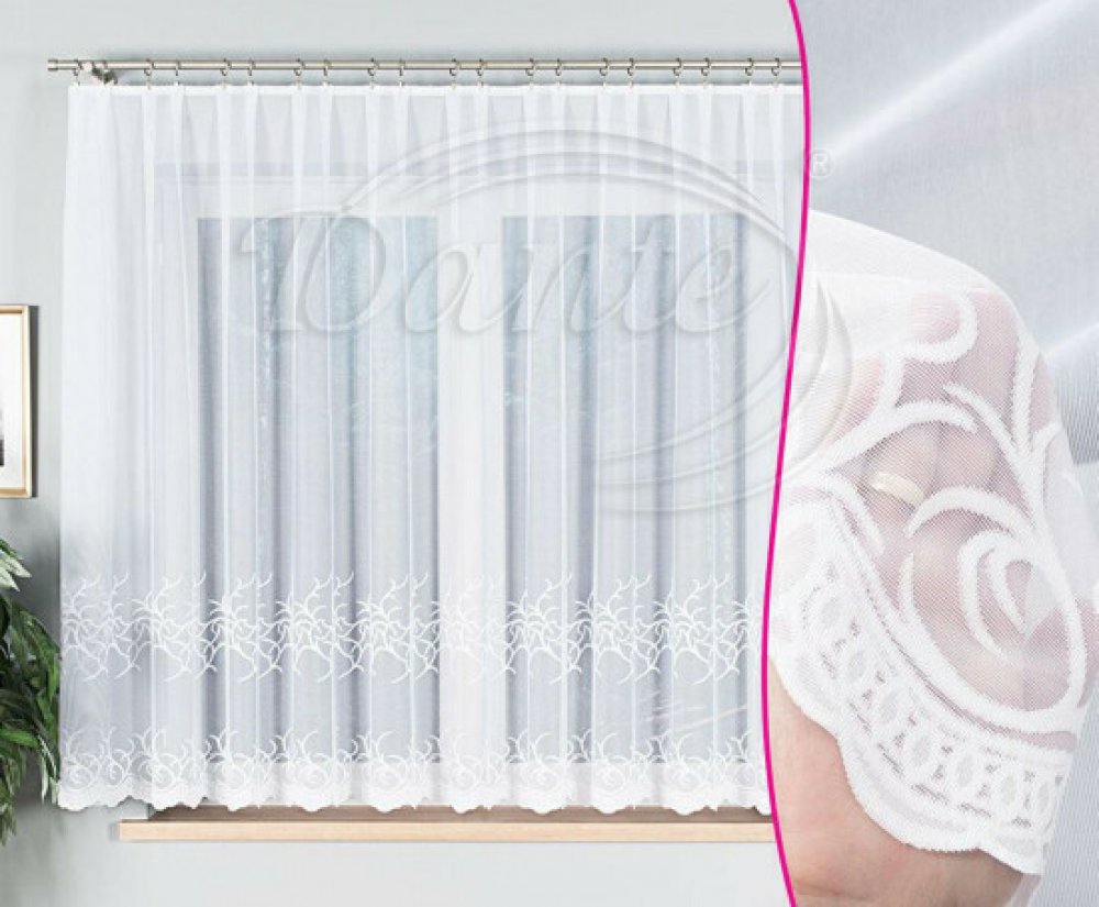Bílá žakárová záclona zaujme svým vzdušným vzhledem, který působí decentně a přitom výrazně ozvláštní interiér.