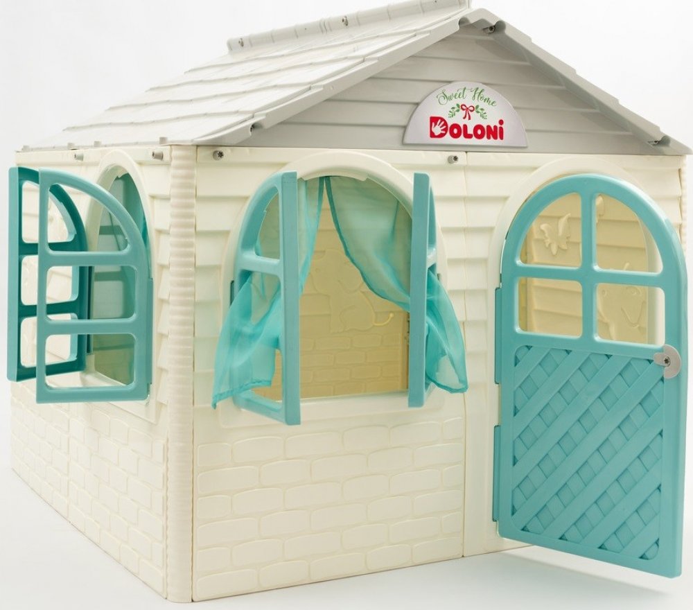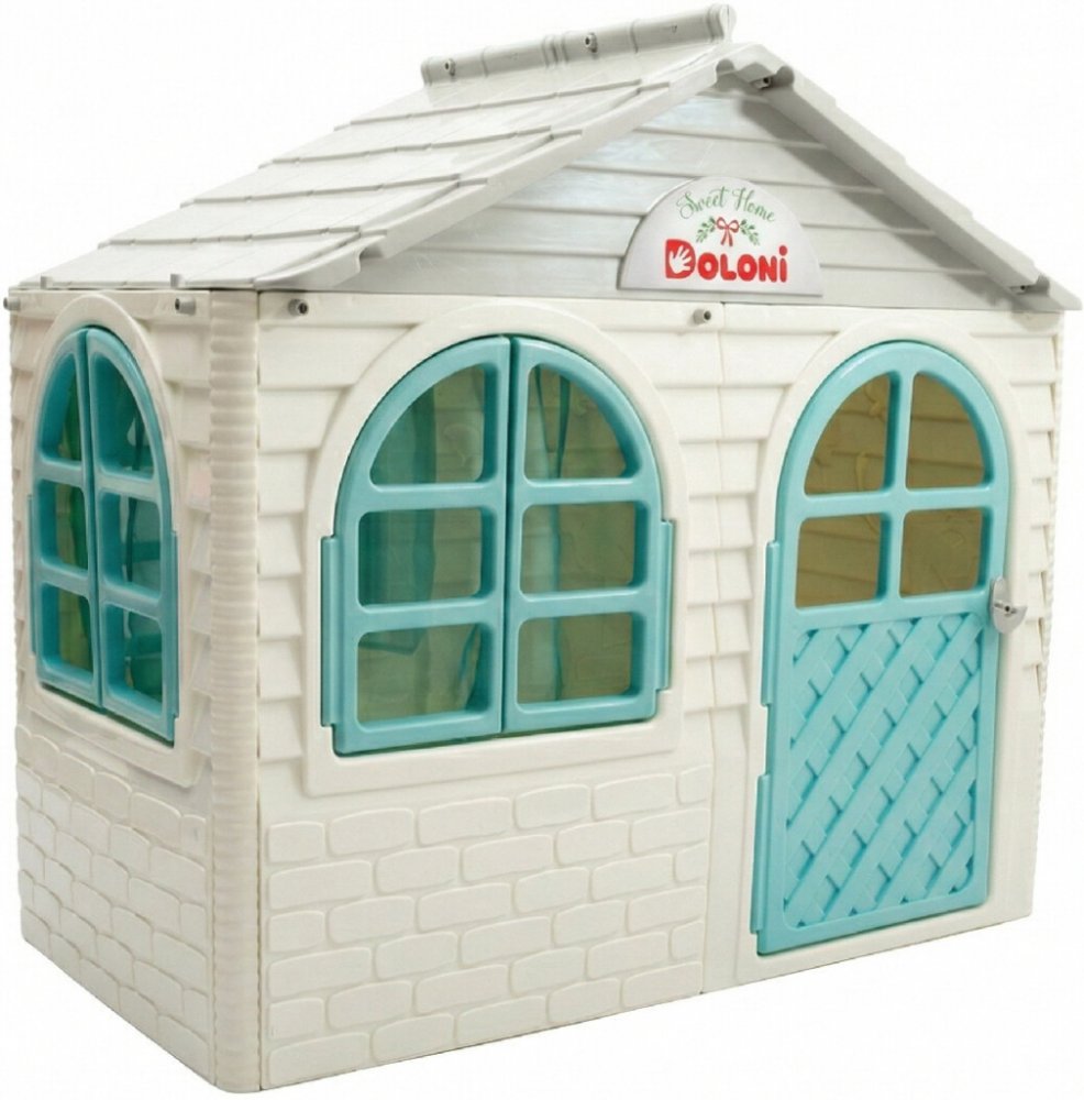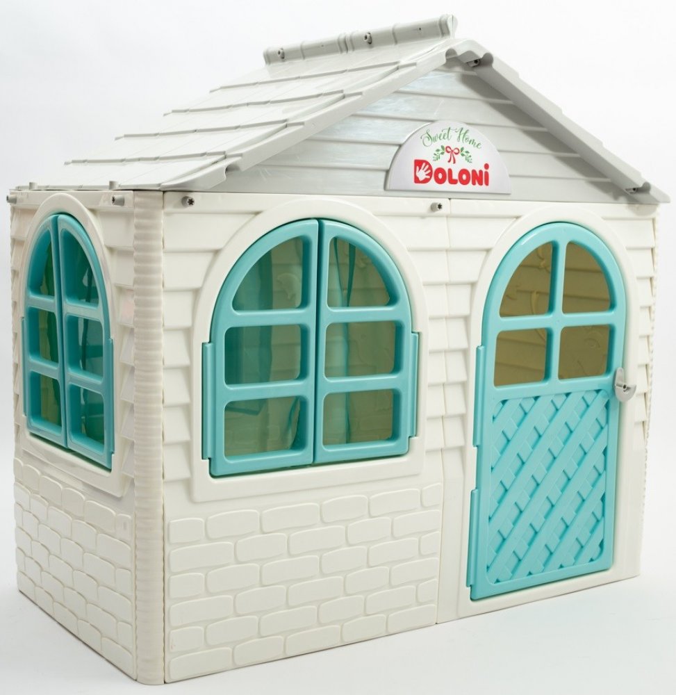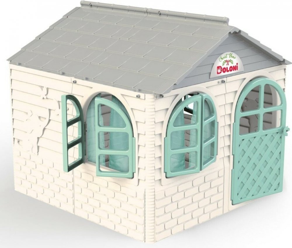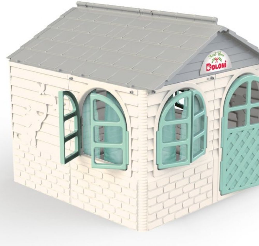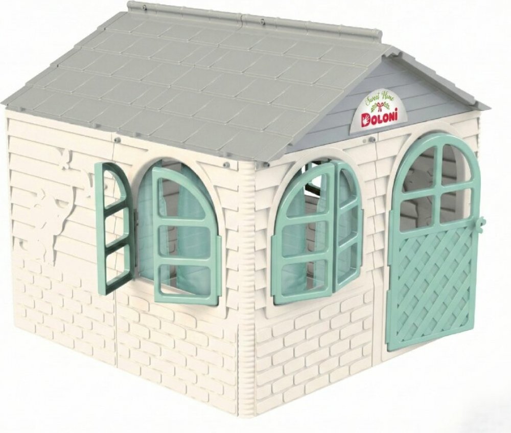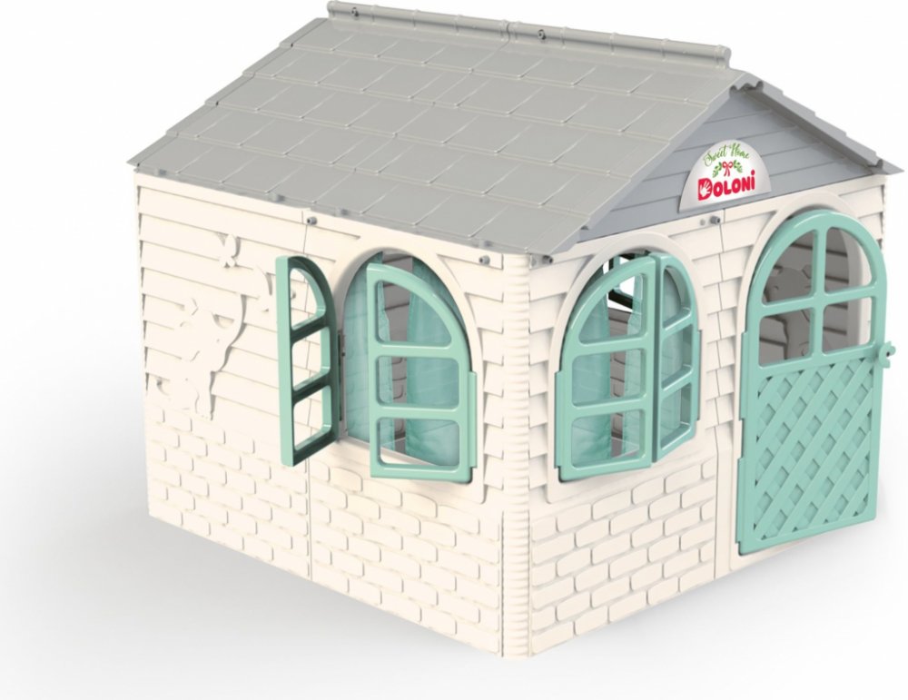 Plastový domeček pro děti je vhodný na zahradu i do dětského pokojíčku. Zahradní domeček má šedou střechu, bílé stěny a zelené okna a dveře. Vše je vyrobeno z kvalitního a odolného plastového materiálu.