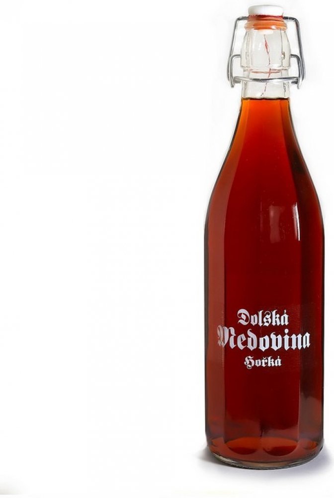 Dolská medovina hořká mandlová v ozdobné lahvi má žlutohnědou barvu a je bez sedimentu.