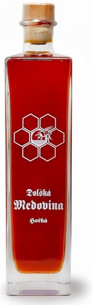 Dolská medovina hořká mandlová v ozdobné lahvi má žlutohnědou barvu a je bez sedimentu.