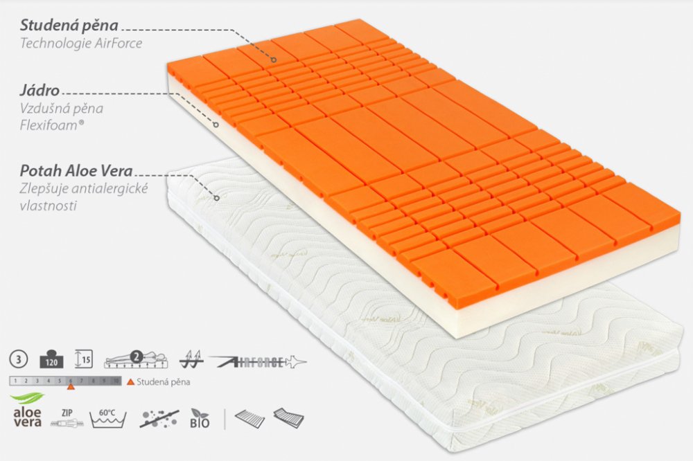 Komfortní sendvičová matrace s vynikajícími ortopedickými vlastnostmi vybavena technologií AirForce. Ložná plocha matrace je tvořena studenou pěnou se speciálním prořezem v příčné i podélné ose, což spolu s jádrem matrace, tvořené ze vzdušně pěny Flexifoam®, zaručuje maximální vzdušnost, odvod přebytečného tepla a vlhkosti. Navíc také podporuje hygienické a antialergické vlastnosti matrace. Potah matrace Aloe Vera obsahující mikrokapsle s přírodním extraktem z Aloe Vera. Při užívání uvolňuje aroma, které má antialergické a antiseptické účinky. Prošívaný dutým vláknem. Pratelný na 60 °C.