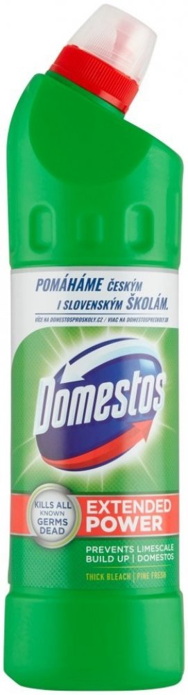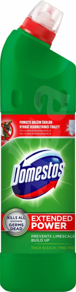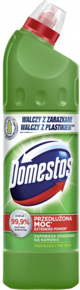 Domestos je tekutý dezinfekční a čistící přípravek, který zabíjí všechny známé druhy bakterií ve vaší WC míse. Díky vylepšenému složení přilne k povrchu toaletní mísy a zůstává rovněž i po spláchnutí. Při každodenním používání chrání Domestos 24 H Plus celý den před bakteriemi uvolněnými z toalety do ovzduší a zároveň bojuje proti bacilům v domácnosti. Domestos je možné používat v celé domácnosti, a to jak v neředěném stavu, tak ředěný s vodou. Vhodný je i pro čištění a dezinfekci úklidových pomůcek. Udržujete hygienickou čistotu s Domestosem. Přípravek místnost provoní svěží vůní borovice.