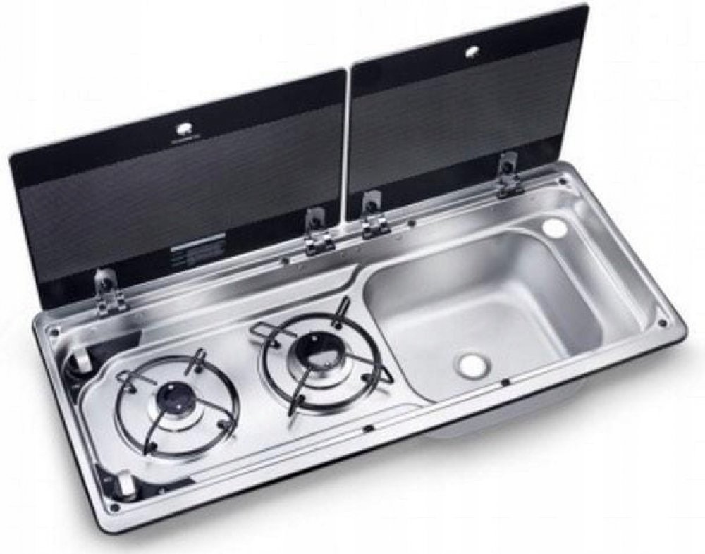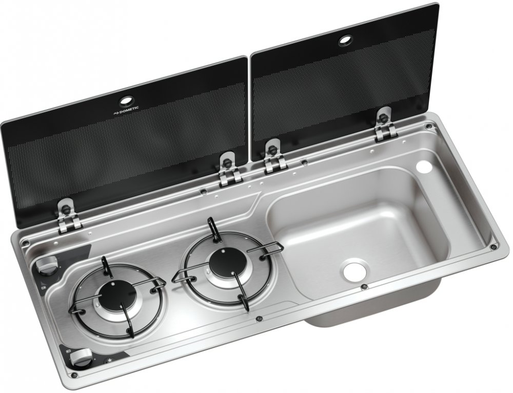 Vestavná kombinace vařiče/dřezu Dometic MO9722R s oddělenými kryty z teplotně odolného bezpečnostního skla a otvorem pro vodovodní baterii. S bezpečnostním zapalovacím systémem a elektronickým zapalováním (nutné připojovací napětí 12 V).