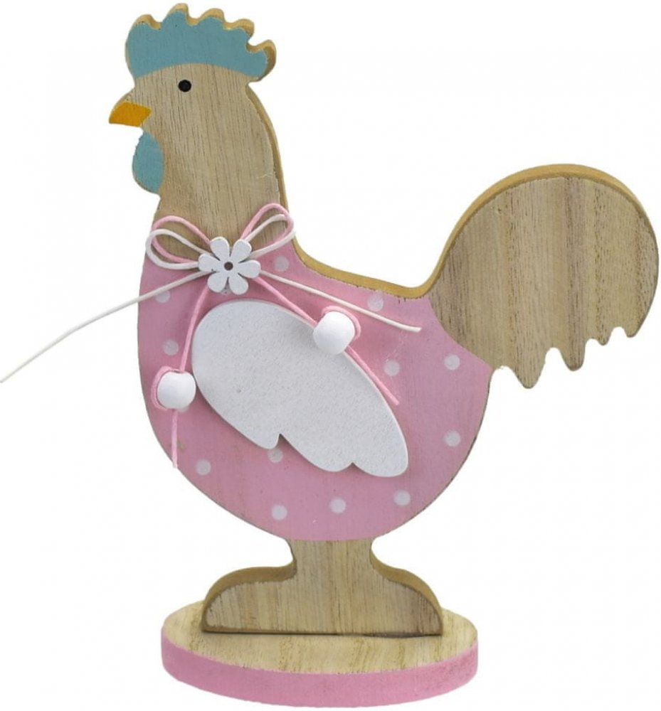Velikonoční dřevěná slepička je širším okolím oblíbená dekorační prvek, který dodá Vašemu interiéru vždy hezký venkovský šmrnc a radostnou atmosféru. Tato růžová slepička je vyrobená z kvalitní překližky a je zdobená barevnou mašličkou s roztomilou vzorkovanou výšivkou.