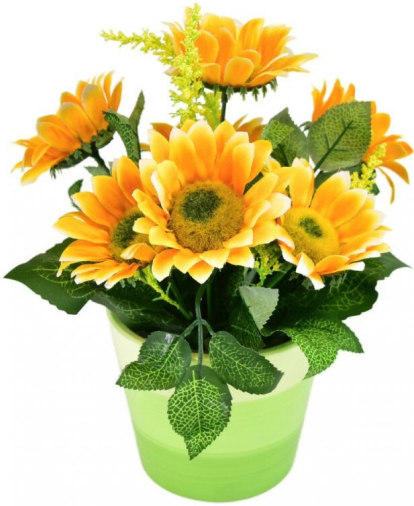 Slunečnice v květináči 26x25 cm jsou krásnou dekorací, která vnese do vašeho domova hřejivou atmosféru pozdního léta a podzimu. Díky tomu, že se jedná o umělou dekoraci, zůstane stále svěží a bez nutnosti péče. Sedm zářivě žlutých květů se zelenými listy je zasazeno do keramického květináče v odstínu zelené. Výhodou je možnost vnitřního i venkovního použití, takže skvěle ozdobí stůl, parapet či terasu. Celá aranžmá má rozměry 26 × 25 × 25 cm, čímž se stane výrazným, ale přitom harmonickým doplňkem.
