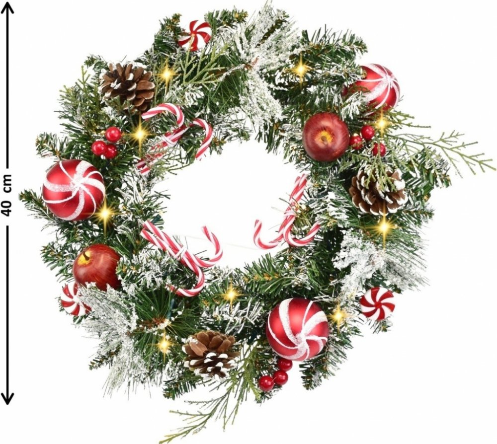 Objevte kouzlo zimního období s naším věnecem zasněženým s červenými koulemi, který vás okouzlí svou elegancí a barevností. Tento nádherný umělý věnec je pečlivě vyroben z umělých zasněžených větviček a bohatě zdobený červenými koulemi, jablíčky, bezinkami, šiškami a imitací cukrátek. Přidejte k tomu svítící řetěz s 10 LED světýlky v teplé barvě a vytvořte si tak dokonalou atmosféru pro sváteční chvíle.