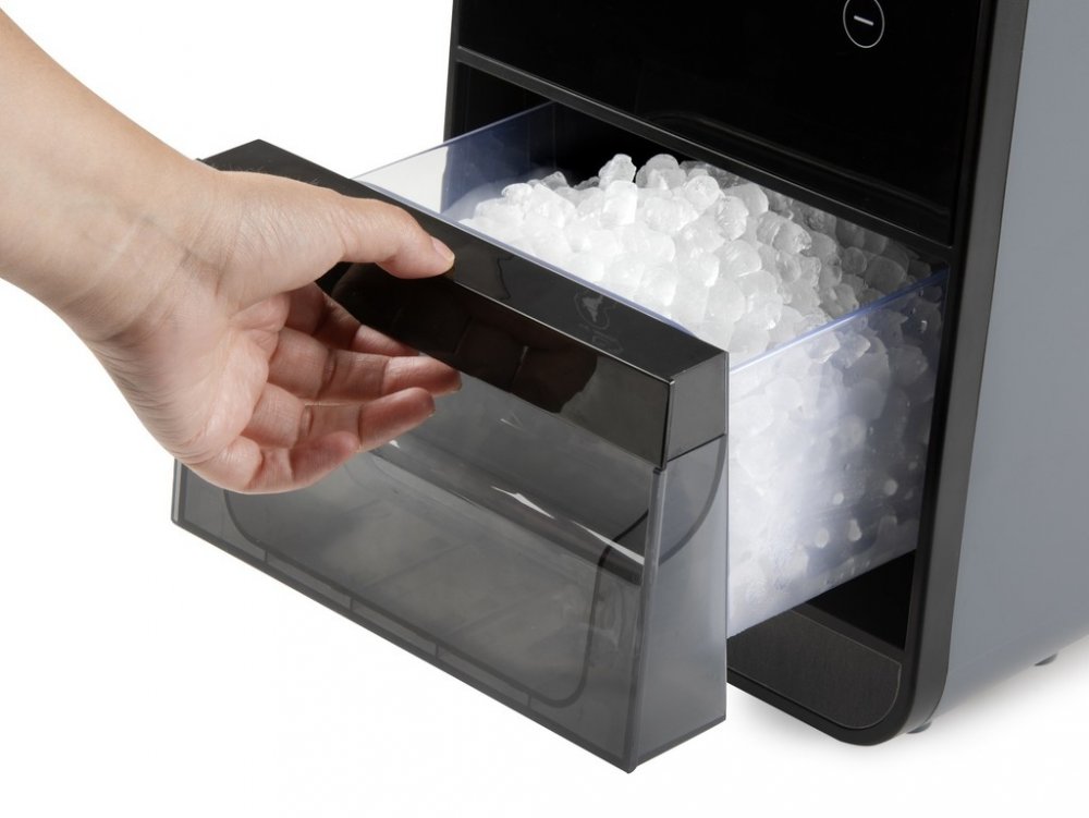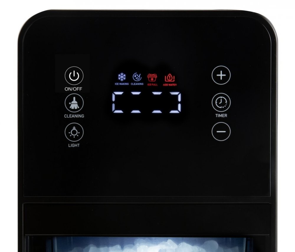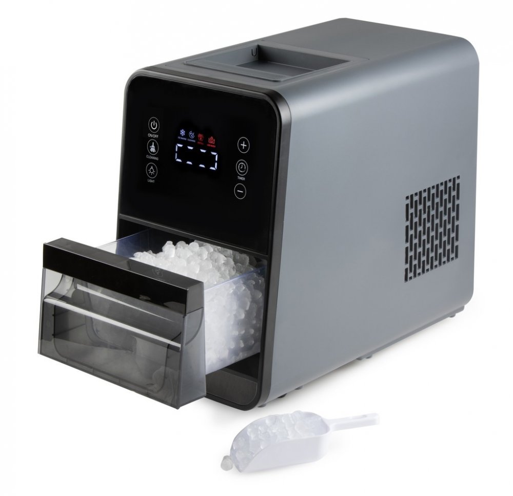 Je vybavený přehledným dotykovým displejem, možnostní nastavení odloženého startu a samočistícím programem. Vnitřní vyjimatelný zásobník hotových ledových nugetek lze osvítit a tím mít dokonalý přehled o procesu tvorby.