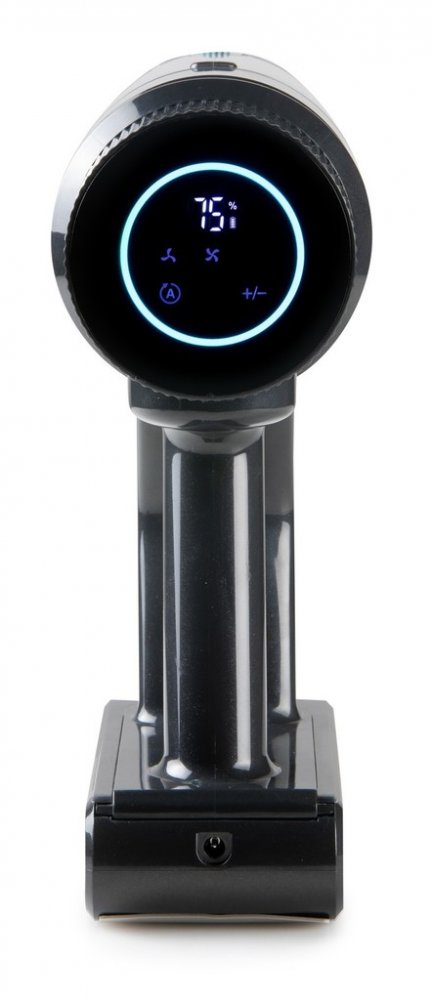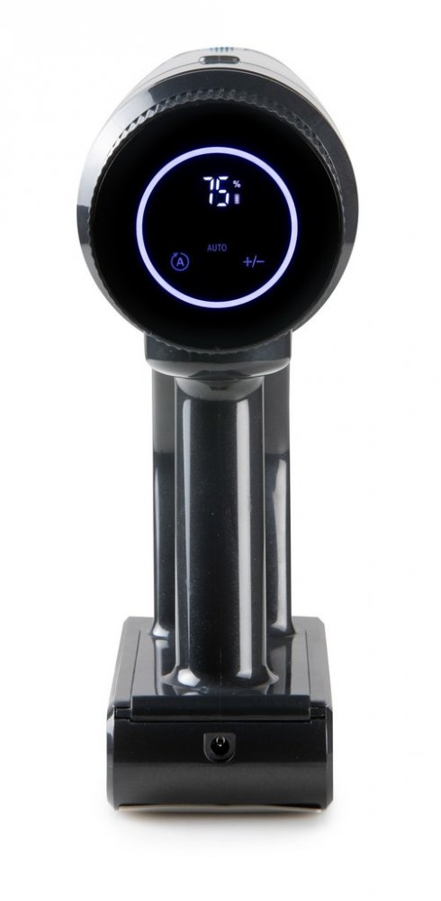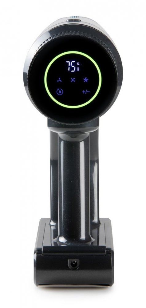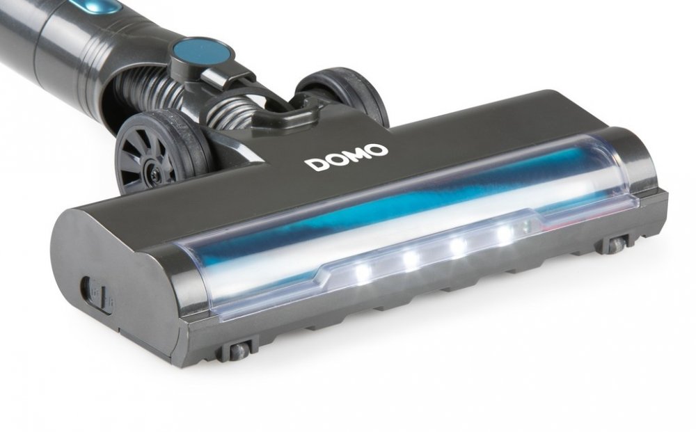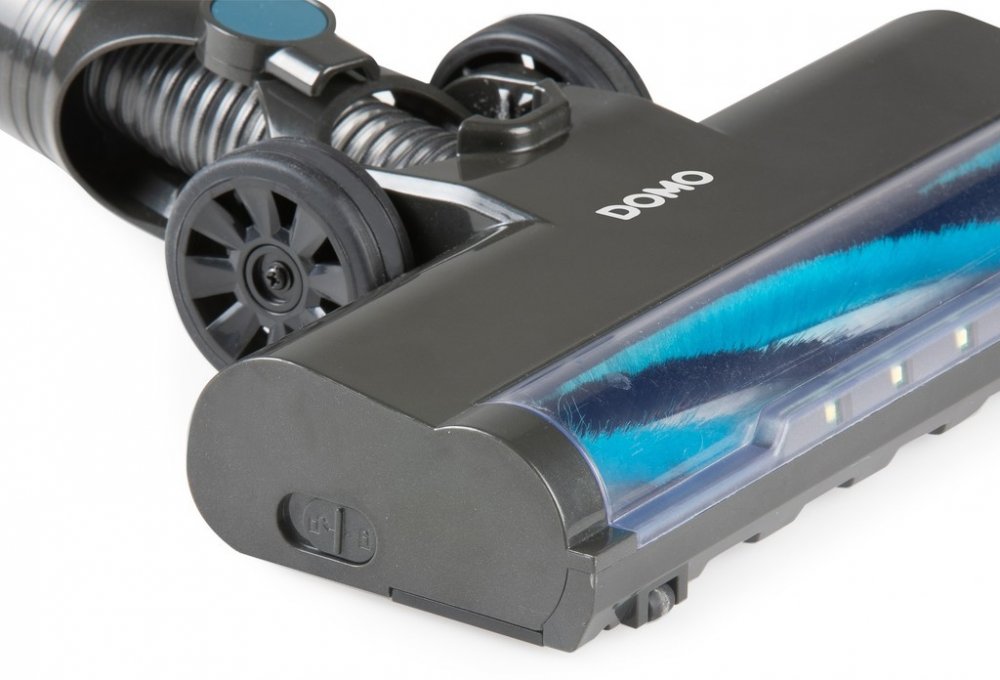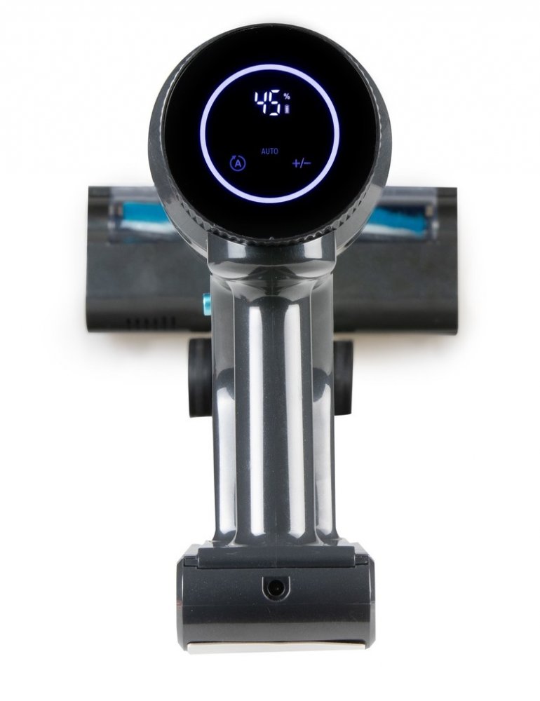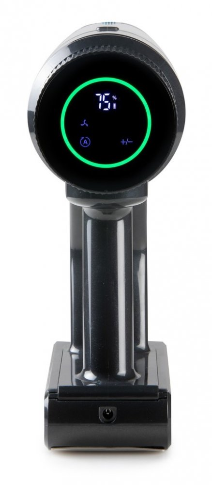 Tlačítko volby výkonu ve 2 stupních LED kontrolky stavu nabití baterie LED s výkonnými diodami osvětlujícími prostoru před hubicí Spoušť pro rychlé otevření a vysypání prachové nádoby