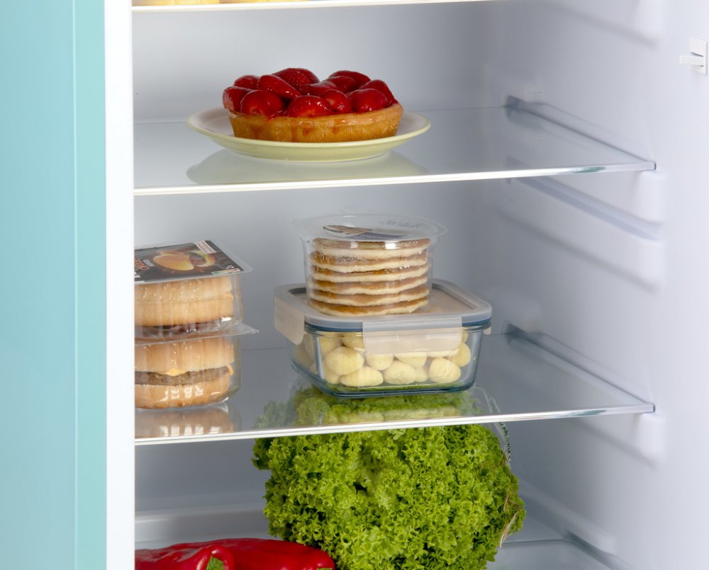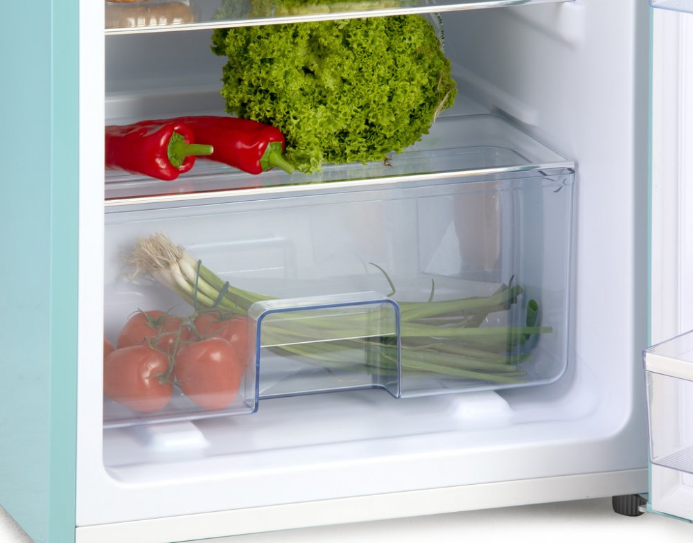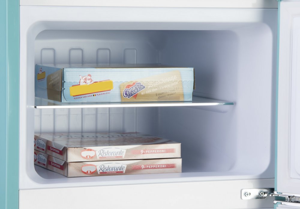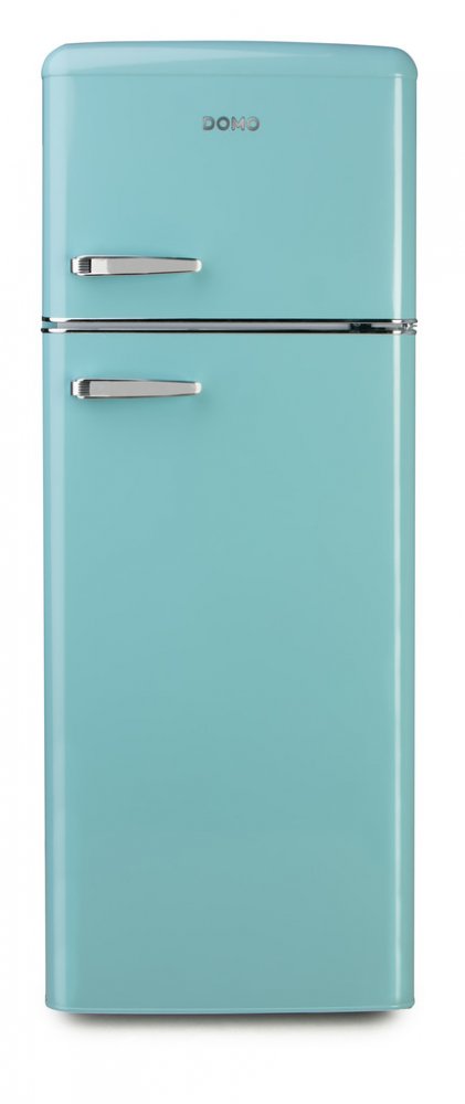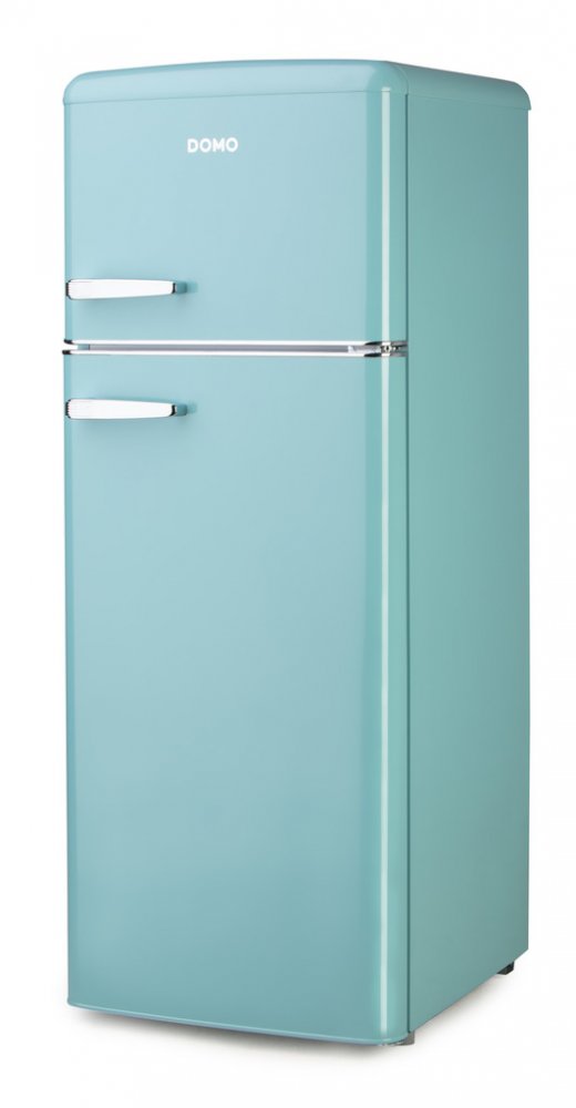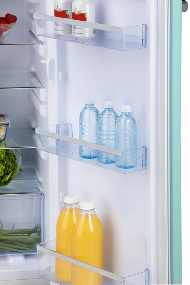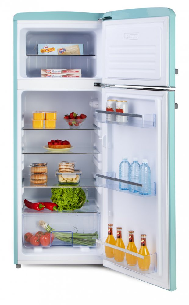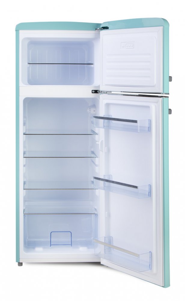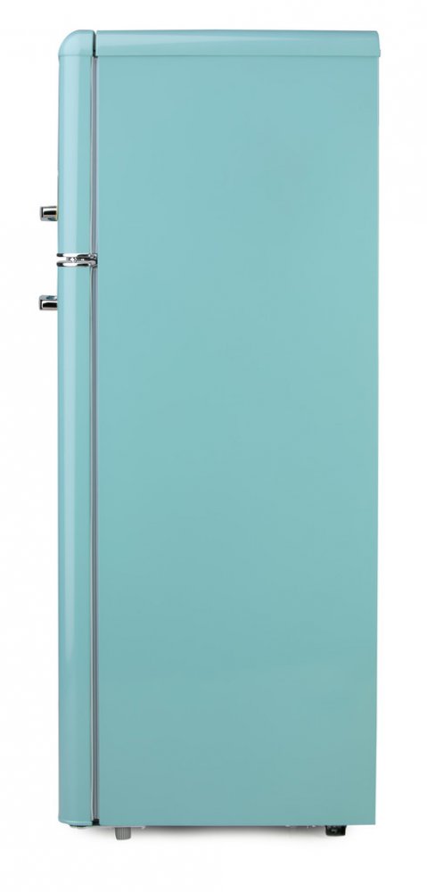 Kompaktní retro lednice v pastelově tyrkysové barvě s výraznými kovovými madly s chromovou úpravou prozáří interiér vašeho bytu a dodá mu nádech výjimečnosti. Lednici s menším mrazákem nahoře oceníte nejen pokud zpracováváte zejména čerstvé suroviny, ale také kvůli její nižší spotřebě.