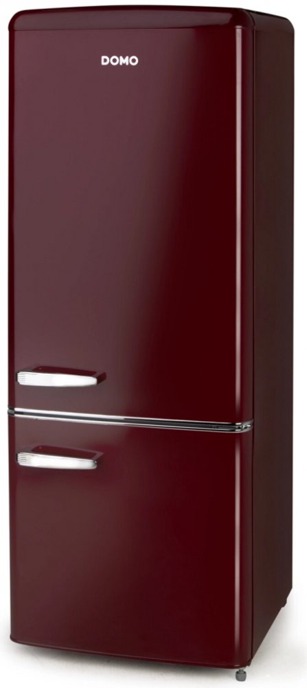 Kombinovaná retro lednice s mrazákem dole. Objem chladničky 147 l. Objem mrazáku 44 l. Energeticky úsporná třída D (145 kwh/rok). Barva bordó a kovová chromovaná madla.