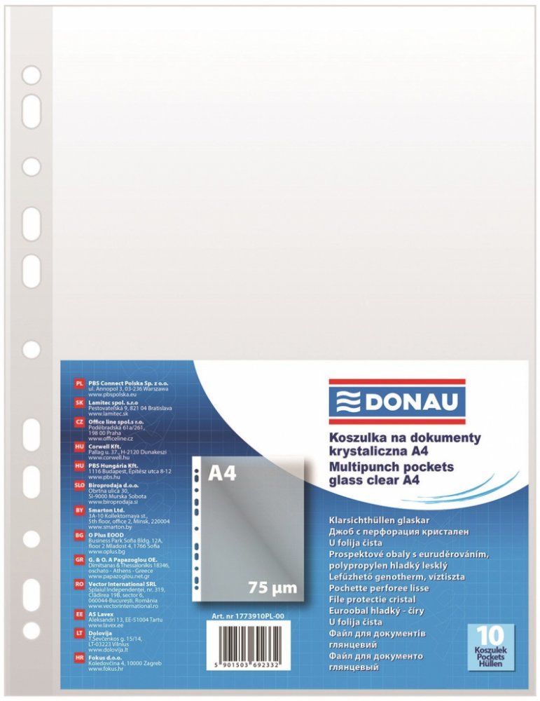 Prospektový obal ve tvaru "U" v lesklém provedení pro zakládání dokumentů do desek a pořadačů. Zavěšení pomocí euroděrování: 11 děr.