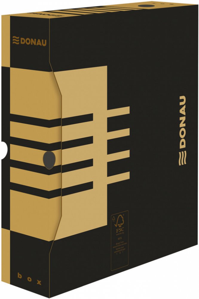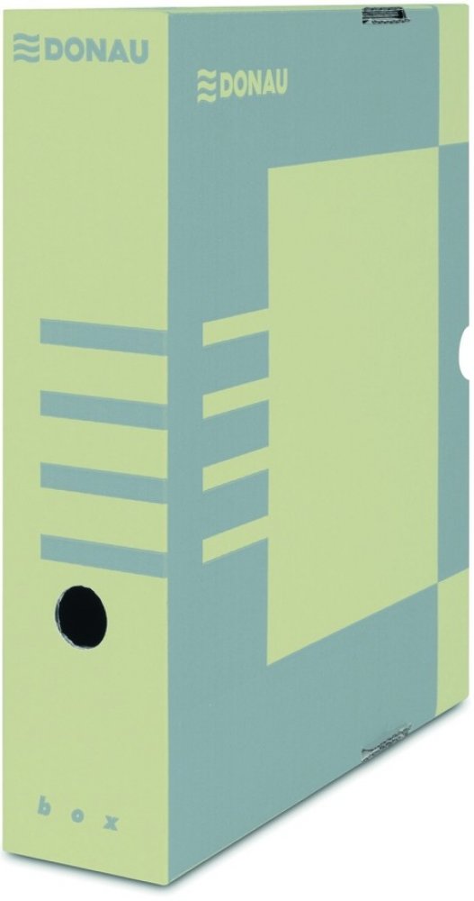 Standardní box pro uložení pákového nebo kroužkového pořadače. Box je vyroben ze 3vrstvé lepenky (390g/m2) s kapacitou cca 700 listů (80g/m2). Šířka hřbetu 80 mm. Lze skladovat rozloženě, snadné sestavení. Stabilní na kratké i delší straně. Pro snadnou manipulaci jsou k dispozici 2 otvory pro vyjmutí obsahu z boxu a 2 pro pohodlné vyjmutí boxu z úložné krabice. Možnost popisu na 5 plochách.