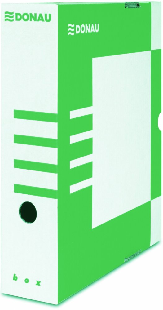 Standardní box pro uložení pákového nebo kroužkového pořadače. Box je vyroben ze 3vrstvé lepenky (390g/m2) s kapacitou cca 700 listů A4(80g/m2). Šířka hřbetu 80 mm. Lze skladovat rozloženě, snadné sestavení. Stabilní na kratké i delší straně. Pro snadnou manipulaci jsou k dispozici 2 otvory pro vyjmutí obsahu z boxu a 2 pro pohodlné vyjmutí boxu z úložné krabice. Možnost popisu na 5 plochách.