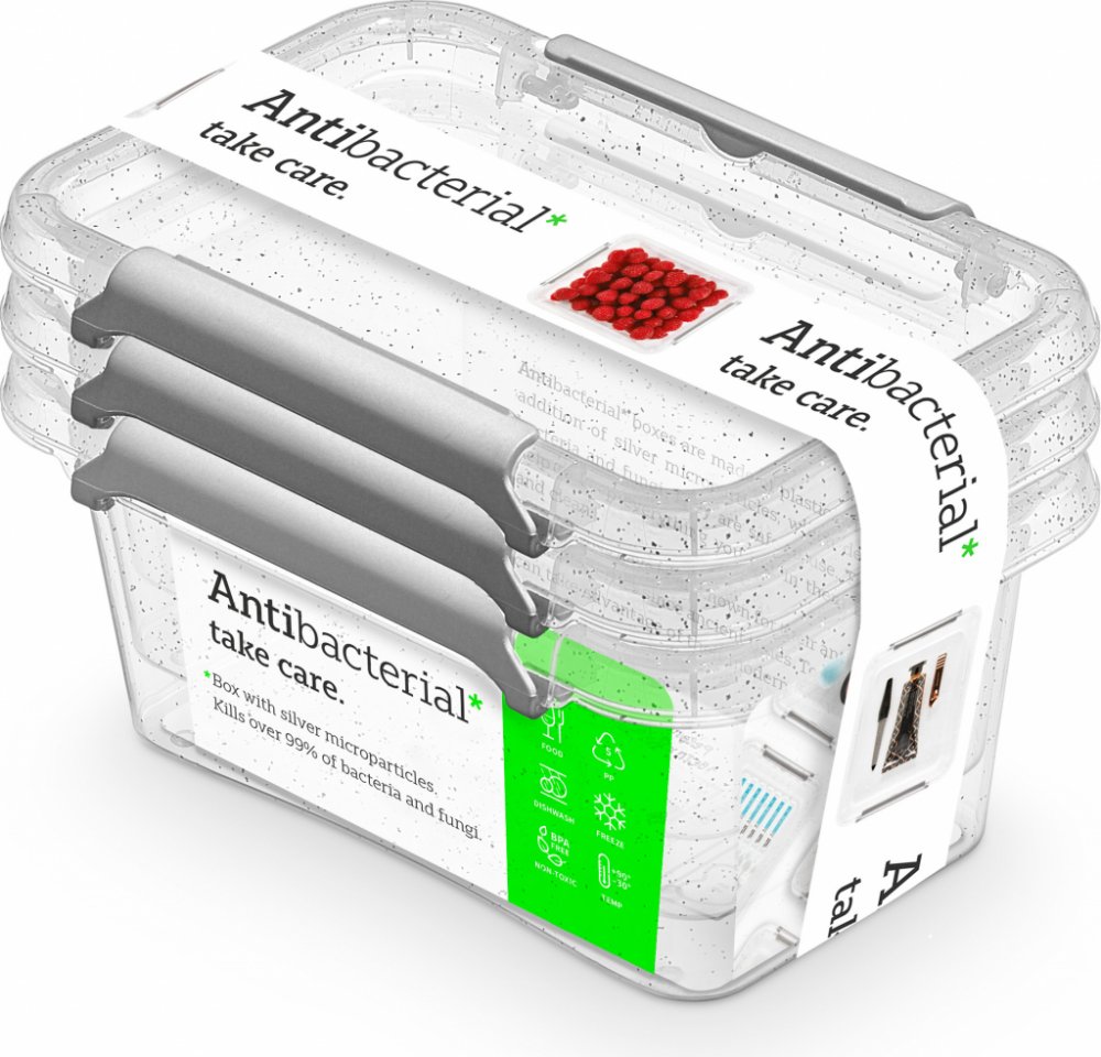 Nanobox je antibakteriální box s obsahem stříbra. Ionty stříbra obsažené v plastu, vč. rukojetí, zámků a víka, účinně chrání proti plísním, široké škále bakterií a jiných patogenů. Ideální pro využití: veřejná místa, - školy, školky, a hygienicky náročných provozů vč. zdravotnických zařízení. Uzavřená nádoba je bezpečnější pro zdraví a pomáhá udržovat její obsah svěží a čistý. Materiál: Polypropylen s obsahem iontů stříbra je bez zápachu, bezpečný pro alergiky, má antibakteriální a oxidační vlastnosti dosahující až 99% účinnosti. Obsah: 3,1 l. Rozměry: 150 x 95 x 95 mm. Vyrobeno v EU.