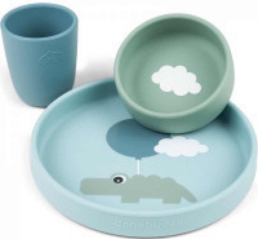 Materiál 100% potravinářský silikon. Velikost talíře: Ø 18 x V 2,5 cm. Mísa: Ø 10 x V 3,5 cm. Hrnek: Ø 6,6 x V 7,5 cm Kapacita hrnku: 160 ml. Miska: 270 ml. Péče: Lze mýt v myčce do 100°C. Vhodné do mikrovlnné trouby. Teplotně bezpečné: -40°C až 230°C. Silikonový jídelní set Happy clouds udělá z jídla zábavu. Praktická protiskluzová a snadno uchopitelná silikonová startovací sada obsahuje dětský talíř, misku a mini hrnek. Perfektní nádobí pro kojence i batolata. Zaoblené vnitřní hrany usnadňují nabírání jídla pro Vaše nejmenší. Dětská jídelní sada ze silikonu je měkká a odolná, odolná vůči teplu a vhodná do mikrovlnné trouby, trouby, mrazničky i myčky nádobí. Talíř Croco, miska a mini hrnek dělají z této dětské jídelní sady perfektní tip na dárek pro malé jedlíky.