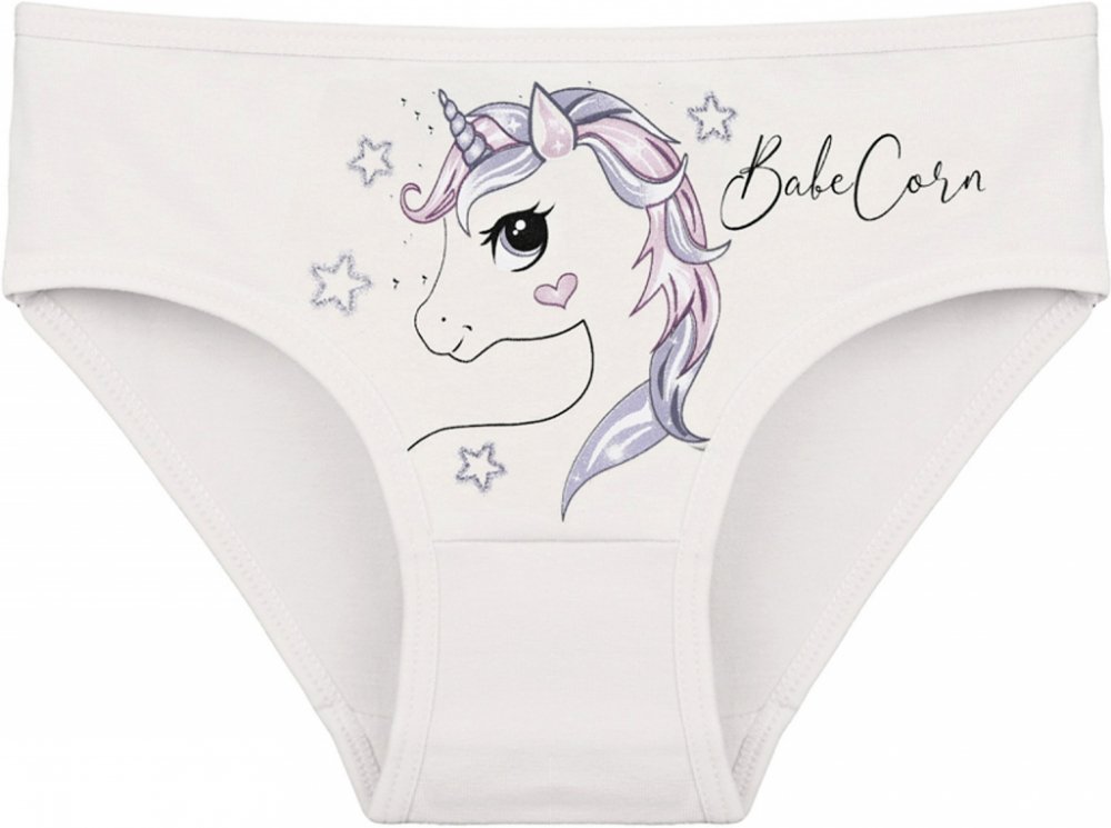 Dětské bavlněné kalhotky Amelia. Dětské kalhotky klasického střihu jsou pohodlné a slušivé, zdobí je obrázek jednorožce. Obzvláště oceníte materiálové složení - 95% bavlna a 5% elasten. Použitý materiál je příjemný a poddajný na dotek.