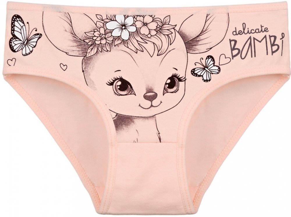 Dětské bavlněné kalhotky Bambi. Dětské kalhotky klasického střihu jsou pohodlné a slušivé, zdobí je obrázek malé srnečky. Obzvláště oceníte materiálové složení - 95% bavlna a 5% elasten. Použitý materiál je příjemný a poddajný na dotek.