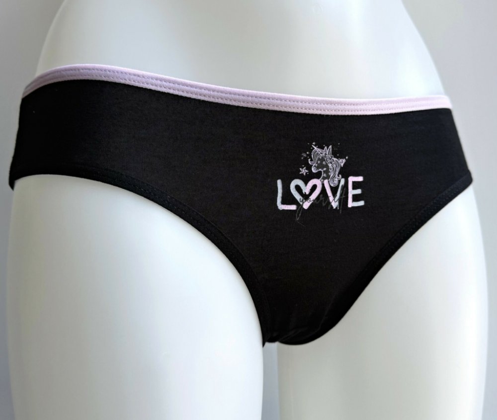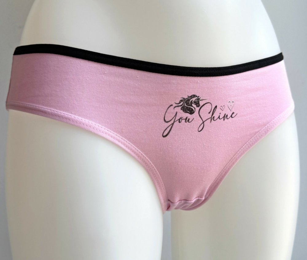Dámské bavlněné kalhotky Bára. Slušivé klasické kalhotky jsou pohodlným typem spodního prádla pro všechny příležitosti. Jsou zdobené malým jednorožcem a nápisem. Obzvláště oceníte materiálové složení - 95% bavlna a 5% elasten. Použitý materiál je příjemný a poddajný na dotek.