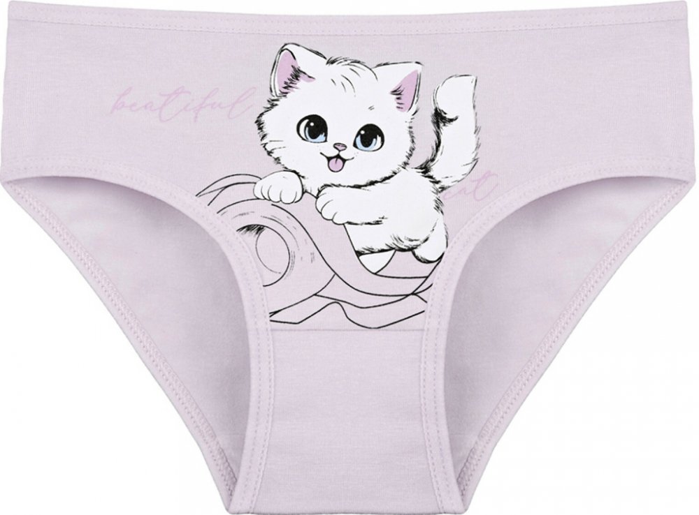 Dětské bavlněné kalhotky Kočička. Dětské kalhotky klasického střihu jsou pohodlné a slušivé, zdobí je obrázek kotěte. Obzvláště oceníte materiálové složení - 95% bavlna a 5% elasten. Použitý materiál je příjemný a poddajný na dotek.