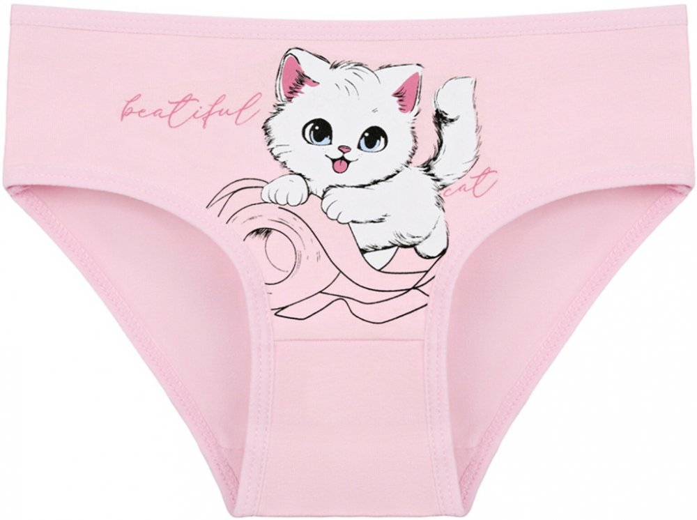 Dětské bavlněné kalhotky Kočička. Dětské kalhotky klasického střihu jsou pohodlné a slušivé, zdobí je obrázek kotěte. Obzvláště oceníte materiálové složení - 95% bavlna a 5% elasten. Použitý materiál je příjemný a poddajný na dotek.