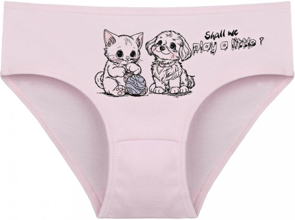 Dětské bavlněné kalhotky Olivia. Dětské kalhotky klasického střihu jsou pohodlné a slušivé, zdobí je obrázek kotěte se štěňátkem. Obzvláště oceníte materiálové složení - 95% bavlna a 5% elasten. Použitý materiál je příjemný a poddajný na dotek.