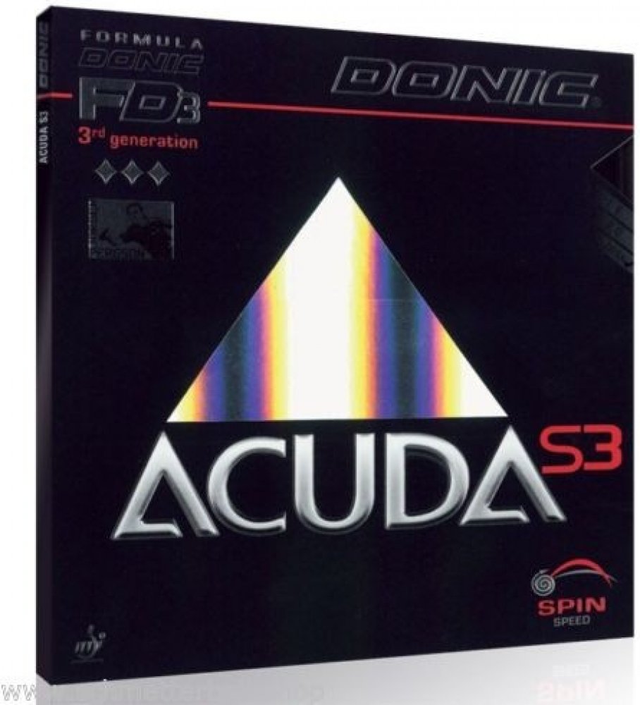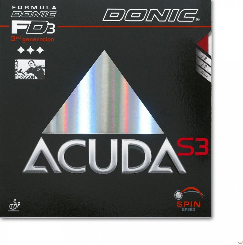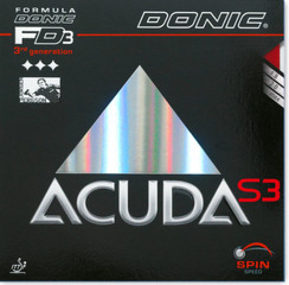 Acuda S3 je potah vyrobený technologií FD3 s měkkou houbou s cílem dodat míčku co největší rotace. Vyšší letová křivka míčku odpustí nejednu chybu a nepřesnost v úderu. Je určený pro topspinovou hru především pro univerzální hráče. Určitě vás zaujme jeho klapavý zvuk. Výsledkem výzkumu je nová technologie s názvem FORMULA DONIC třetí generace - FD3. Potahy s touto převratnou technologií jsou vyráběny ve dvou sériích - ACUDA a COPPA X. Acuda S1, Coppa X1 Turbo (Platin) a Coppa X1 Gold patří díky speciální struktuře pórů v houbě k nejrychlejším potahům určených pro vyložené útočníky. Potahy Acuda S2 a S3 stejně jako Coppa X2 (Platin Soft) a X3 (Silver) jsou určené pro technické útočníky a topspináře. Díky měkké houbě jsou velmi příjemné a lehce kontrolovatelné při topspinové hře.