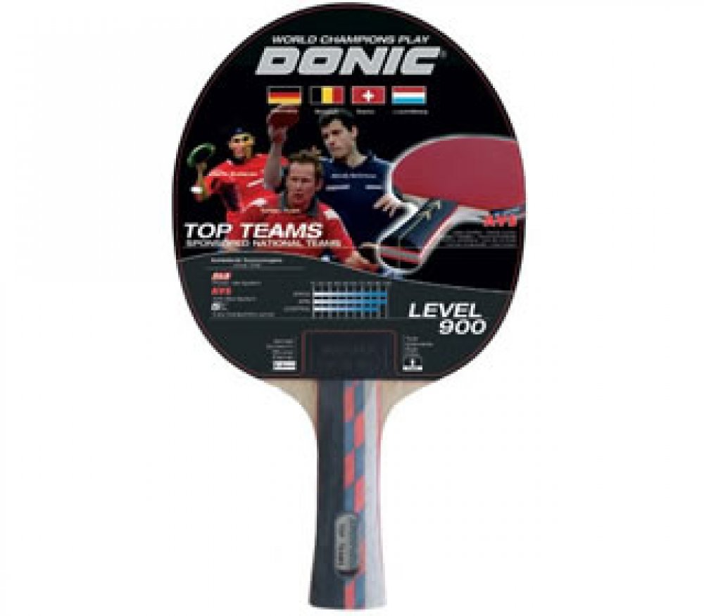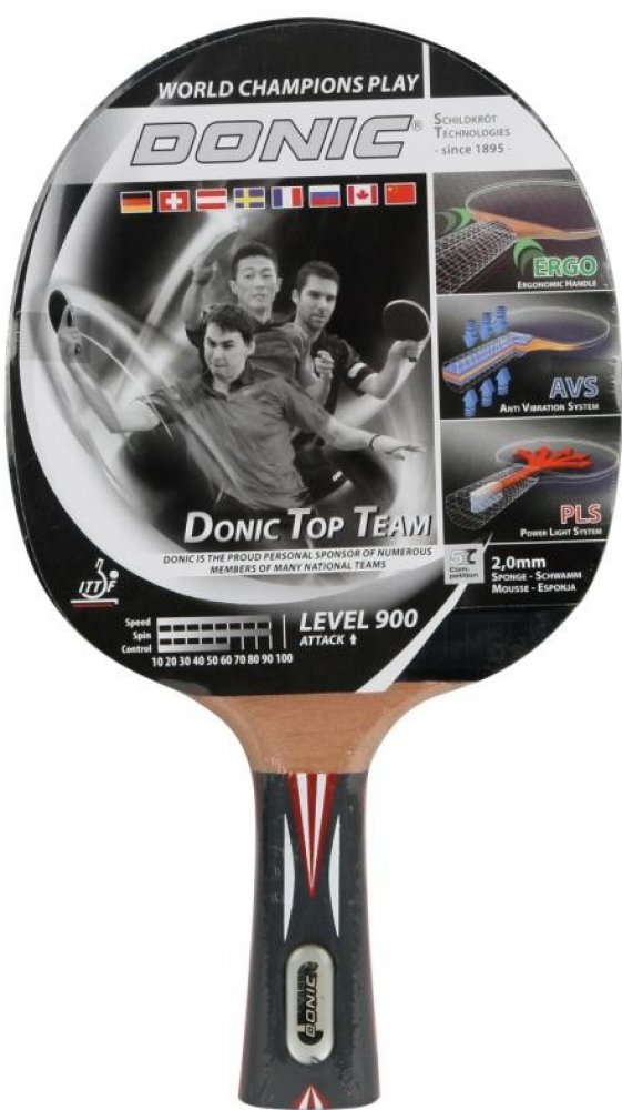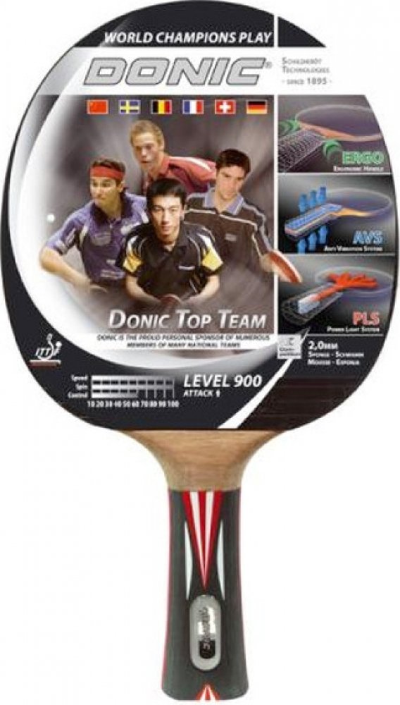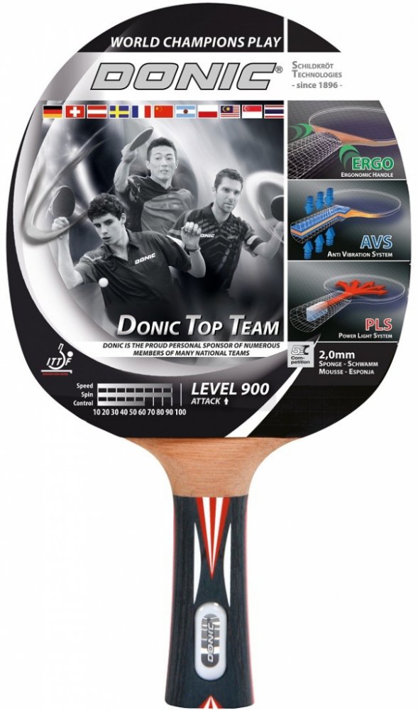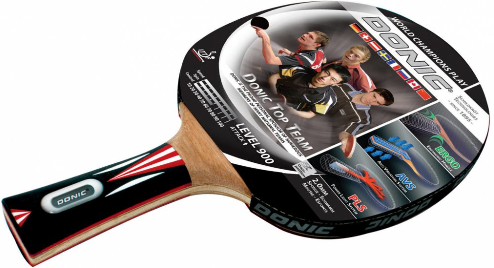 Top Team 900 od výrobce Donic je jedním z top modelů v této řadě. Model je vybaven řadou technologií, které zajišťují optimální zábavu a velmi efektivně přenášejí vaši herní techniku na míček. Tato raketa se svými kvalitními vlastnostmi byla navržena pro ambiciózní sportovce. Pokud jde o kvalitu dřeva a přilnavosti, tento prémiový model je vybaven vysoce kvalitním potahem Alpha Slick od Schildkröt schválenou ITTF, který generuje extra sílu díky své 2,0 mm tloušťce. Povrch se tak vyznačuje vynikající přilnavostí a maximální rotací a podporuje všechny myslitelné herní techniky. Takzvaná ERGO rukojeť se sedí v ruce mnohem lépe než klasické rukojeti a vyhýbá se otlakům na ukazováčku. Tato technologie ze soutěžního sportu si nyní nachází cestu i do oblasti rekreačních raket a umožňuje tak superrychlé přepínání z forehandu na backhand (a naopak). Díky technologii PLS (Power Light System) je raketa, která má dutou rukojeť, lehčí. Výsledkem je skvělá ovladatelnost se zlepšenou silou úderu. Také vestavěná technologie AVS (Anti Vibration System) mezi čepelí a rukojetí znatelně snižuje vibrace a umožňuje tak menší únavu při hraní. Pálka je určena především hráčům, kteří upřednostňují útočnou hru.