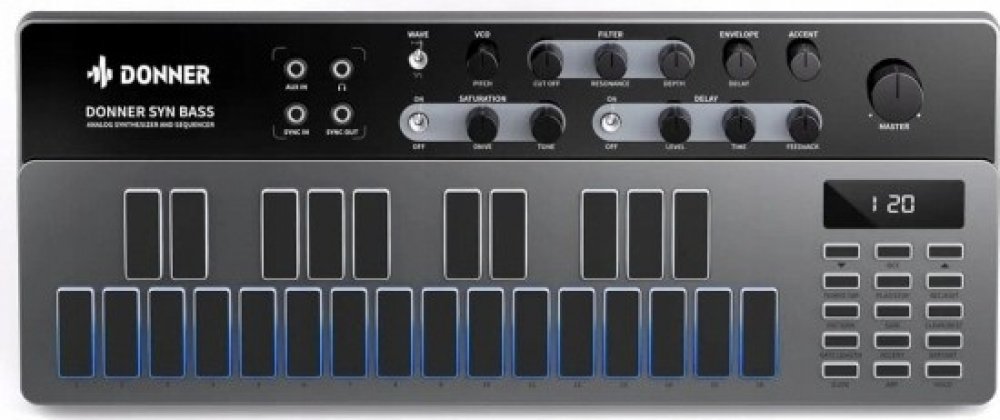 Analogový basový syntezátor a sekvencer Donner B1 s efekty VCF, saturací a delayem. Analogový basový syntezátor Donner B1 učinil bezprecedentní inovace v ovládacím rozhraní a poskytuje tak jednodušší a intuitivnější rozhraní pro všechny milovníky hudby. A tato inovace získala ocenění Red Dot Design Award 2022. Optimalizovali sekvencer tohoto syntezátoru, aby se dal snadněji a intuitivněji používat. Snadno upravujte své vlastní sekvence pomocí 128 předvoleb sekvencí pokrývajících celou řadu hudebních stylů a 128 uživatelsky programovatelných předvoleb. Sekvencer Donner B1 obsahuje moderní silikonové klávesy s podsvícením měnícím barvu. Kromě sekvenování můžete pomocí kláves hrát i živě své syntezátorové linky. Získejte autentické analogové hluboké basové tóny spojené se zkreslením a páskovým delayem pro všechny retro zvuky. Ideální pro producenty elektronické hudby, DJe a hip-hopové producenty. Kontroler B1 má rozhraní MIDI IN/OUT, které připojuje B1 k vašim externím MIDI zařízením pro sekvenování nebo pouze jako MIDI kontrolér. Připojte externí zdroje zvuku pomocí 1/8” audio vstupu. 1/4" TS mono Main Out nese hlavní výstupní signál. Ovladač a sekvencer B1 obsahuje všechny hluboké basové a kyselé zvuky syntezátoru klasického syntezátoru, ale přináší je zpět v intuitivnějším formátu. Basový syntezátor B-1 vám nabízí dokonalou kombinaci retra a new s