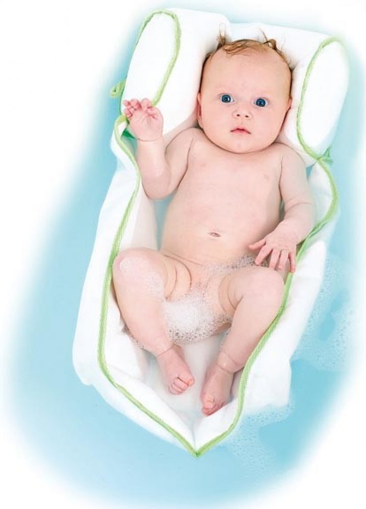 dítě leží částečně ve vodě , rodič tak má zcela volné ruce pro umývání dítěte
