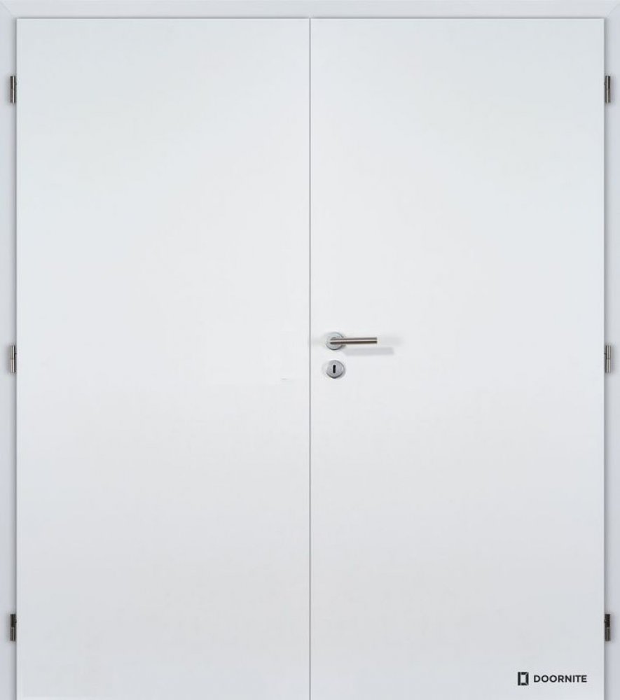 Interiérové plné dveře Doornite v povrchové úpravě Basic bílý lak. Dvoukřídlé plné dveře 160 cm pravé s nejčastěji používanou výplní voština opatřeny mezipokojovým zámkem.