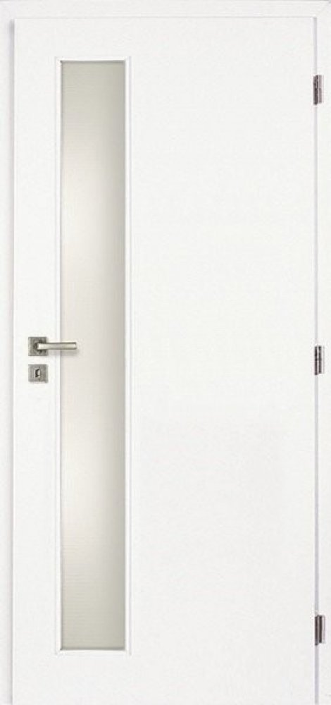 Bílé dveře s podélným pruhem na straně kliky s výplní z pískovaného skla. Jednoduché dveře do moderních interiérů. Křídla dveří jsou opláštěna HDF lakovanou deskou. Jako výplň je zde, nejběžněji využívaná, voština. Jedná se o tvrzený papír v několika vrstvách, uspořádaný do tvaru šestiúhelníku - včelí plástev o průměru 25 mm. Interiérové dveře se vyrábějí jak v jednokřídlé, tak i dvoukřídlé variantě, ve standardních šířkách jednokřídlých dveří 60 - 110 cm nebo 125 - 185 cm u dveří dvoukřídlých. Standardní výška dveří je 197 cm. Nezapomeňte si ke svým dveřím vybrat odpovídající obložkovou zárubeň.
